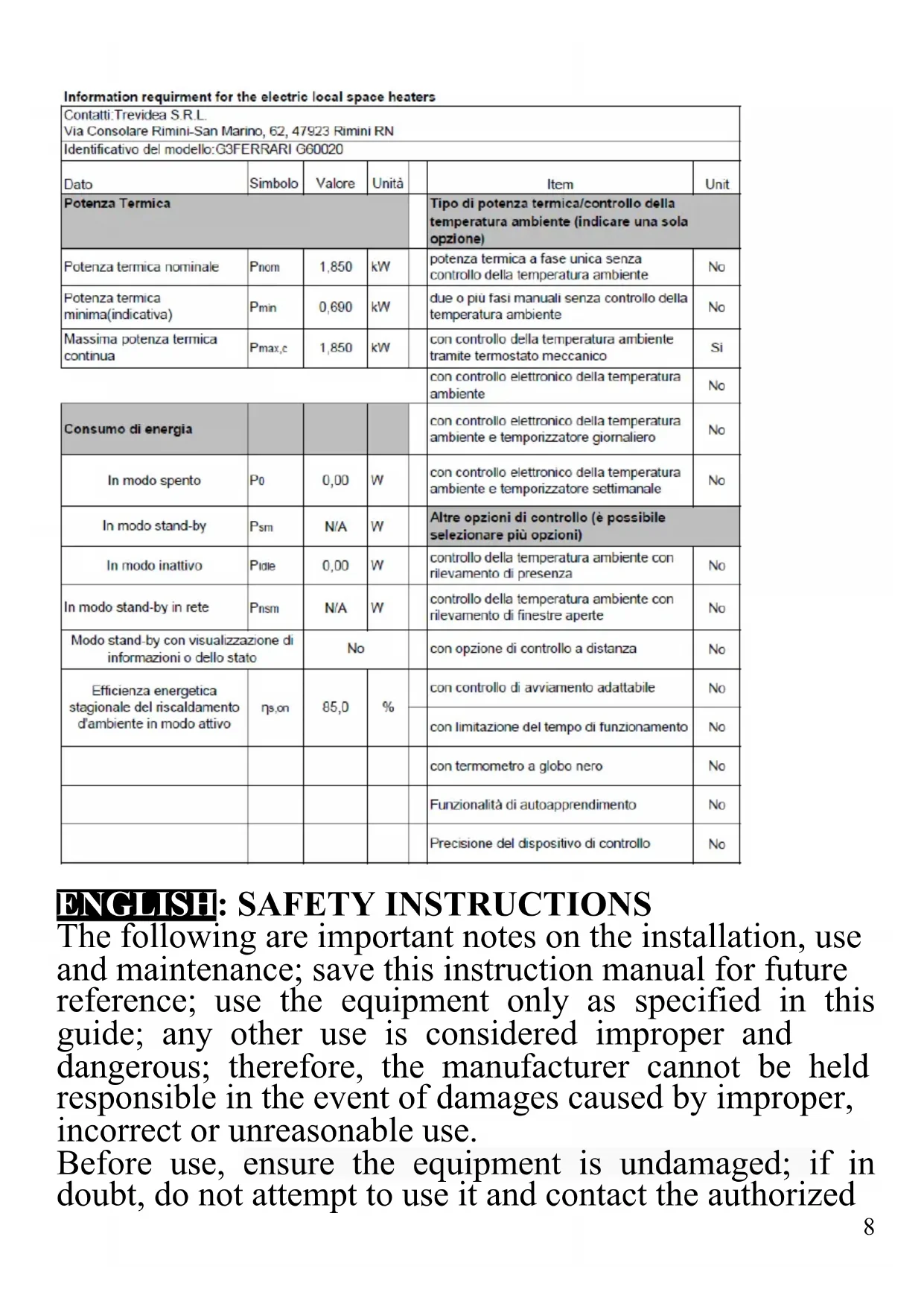 The following are important notes on the installation, use and maintenance; save this instruction manual for future reference; use the equipment only as specified in this guide; any other use is considered improper and dangerous; therefore, the manufacturer cannot be held responsible in the event of damages caused by improper, incorrect or unreasonable use. Before use, ensure the equipment is undamaged; if in doubt, do not attempt to use it and contact the authorized9 service center; do not leave packing materials (i.e. plastic bags, polystyrene foam, nails, staples, etc.) within the reach of children as they are potential sources of danger; always remember that they must be separately collected. Make sure that the rating information given on the technical label are compatible with those of the electricity grid; the installation must be performed according to the manufacturer's instructions considering the maximum power of the appliance as shown on the label; an incorrect installation may cause damage to people, animals or things, for which the manufacturer cannot be considered responsible thereof. If it is necessary to use adapters, multiple sockets or electrical extensions, use only those that comply with current safety standards; in any case do not exceed the power consumption limits indicated on the electrical adapter and / or extensions, as well as the maximum power shown on multiple adaptor. Do not leave the unit plugged; better to remove the plug from the mains when the device is not in use. Always disconnect from power supply if you leave it unattended. Cleaning operations should be carried out after unplugging the unit. If the unit is out of order and you do not want to fix it, it must be made inoperable by cutting power cord. - Do not allow the power cord to get closer to sharp objects or in contact with hot surfaces; do not pull it to disconnect the plug. - Do not use the appliance in the event of damage to the power cord, plug, or in case of short circuits; to repair the product only address an authorized service center. - Do not handle or touch the appliance with wet hands or bare feet. Do not expose the appliance to harmful weather conditions such as rain, moisture, frost, etc.. Always store it in a dry place.10 - Children must not play with the appliance. - Children less than 3 years should be kept away from unit if not continuously supervised. - Children between 3 and 8 years can only switch on and off appliance, only if it is placed or installed in its normal functioning position and if they receive supervision and instructions about safe use of the appliance, and understand relative dangers. Children between 3 and 8 years must not insert the plug, set or clean or make the maintenance of the appliance. - CAUTION: some parts of this appliance can become very hot and cause skin burning. Pay big attention in presence of children or vulnerable persons. - Keep the appliance and its cord out of reach of children less than 8 years. If the power cord is damaged, or in case of failure and / or malfunction do not tamper with the unit. The reparation must be done by manufacturer or by service center authorized by the manufacturer in order to prevent any risk. Failure to comply with the above may compromise the unit safety and invalidate the warranty.