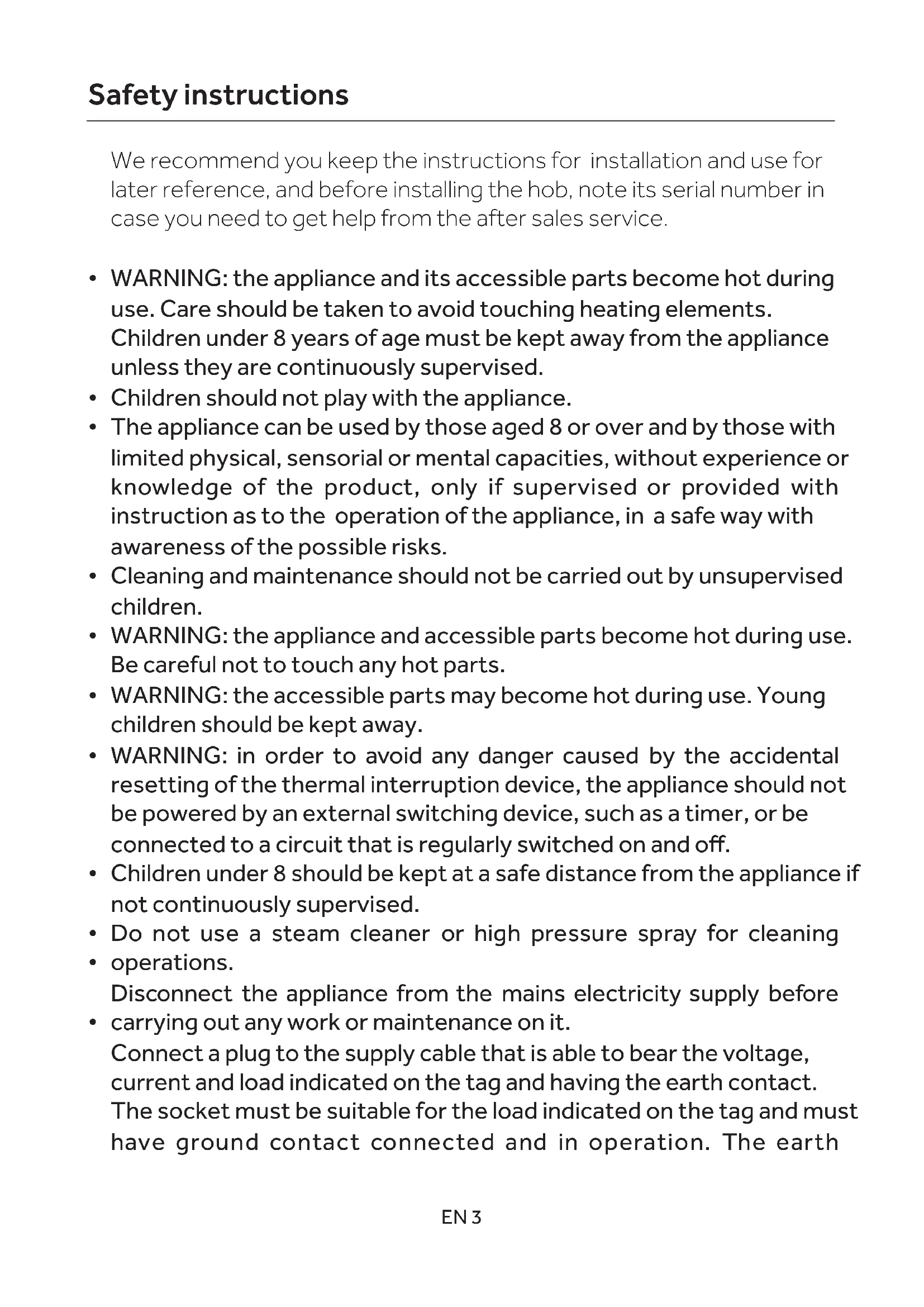 resetting of the thermal interruption device, the appliance should not be powered by an external switching device, such as a timer, or be connected to a circuit that is regularly switched on and off. Disconnect the appliance from the mains electricity supply before carrying out any work or maintenance on it. Children under 8 years of age must be kept away from the appliance unless they are continuously supervised.