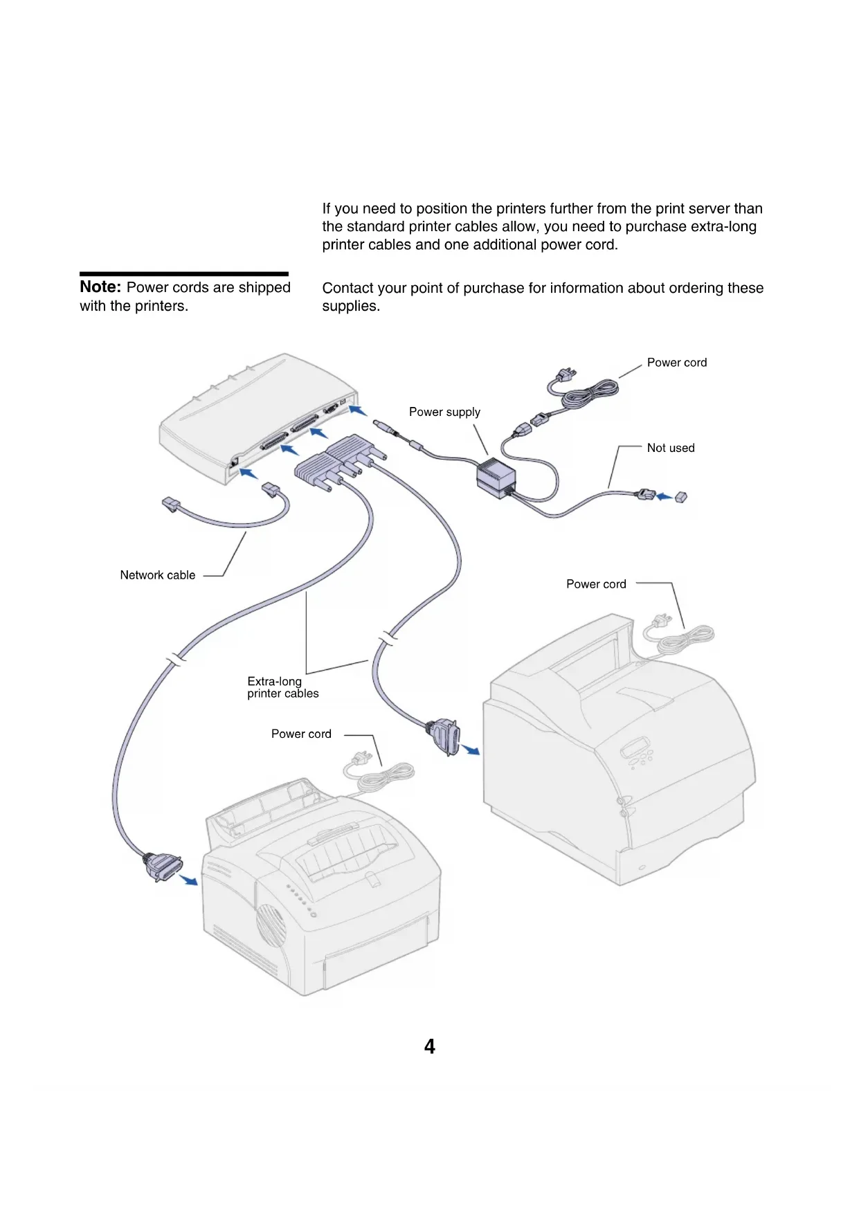- Safety notices Setup information Step 1: Connect the hardware 1 Turn off and unplug your printers. 2 Connect the network and printer cables. If you are connecting only one parallel printer, use port PAR 1 on the print server. 3 Connect the print server power supply. Note: The three-port model (shown in the illustration) has two parallel ports and one serial port. The one-port models are parallel only. For information about using the serial port, refer to the online documentation on the drivers CD that shipped with your print server. MarkNet™ External Print Servers support Ethernet or Token-Ring networks. 4 Plug all the power cords into properly grounded electrical outlets. The print server turns on automatically. 5 Turn on the printers. 6 Press and release Menu and Test simultaneously to reset the print server. The Menu and Test buttons are located on top of the print server.3 Power cord Printer cable port PAR 1 Network cable Power supply Power cord Printer cable port PAR 24 If you need to position the printers further from the print server than the standard printer cables allow, you need to purchase extra-long printer cables and one additional power cord. Note: Power cords are shipped with the printers. Contact your point of purchase for information about ordering these supplies. Power cord Extra-long printer cables Network cable Power supply Not used Power cord Power cord5 Step 2: Assign an IP address You must assign an IP address, netmask, and gateway to the print server in order for other network devices to find the attached printers. If your network is using DHCP, address values are automatically assigned. To verify the address assignment, print a network setup page and make sure the IP address, netmask, and gateway appear as non zero. Follow the instructions in “Step 3: Print a network setup page” to view this information. Note: Information about other ways to set an IP address is also on the drivers CD. If your network is not using DHCP, you must manually assign an IP address. One of the easiest ways is to use the Print Server Setup Utility on the drivers CD. Click What’s on this CD and look for Print Server Setup Utility to find information about installing and using the utility. Step 3: Print a network setup page Press Test to print a network setup page. The page prints on the printer connected to port PAR 1 on the print server. Check under the TCP/IP heading to verify your IP address, netmask, and gateway settings are non zero. After the network setup page prints, the printer returns to a Ready state.6 Step 4: Configure the network printer After you have assigned and verified the TCP/IP settings, you are ready to configure the printers attached to the print server and set up your network clients to print to them. Windows In Windows environments, your network printers can be configured for direct printing or for shared printing. Supported printing methods p. 112