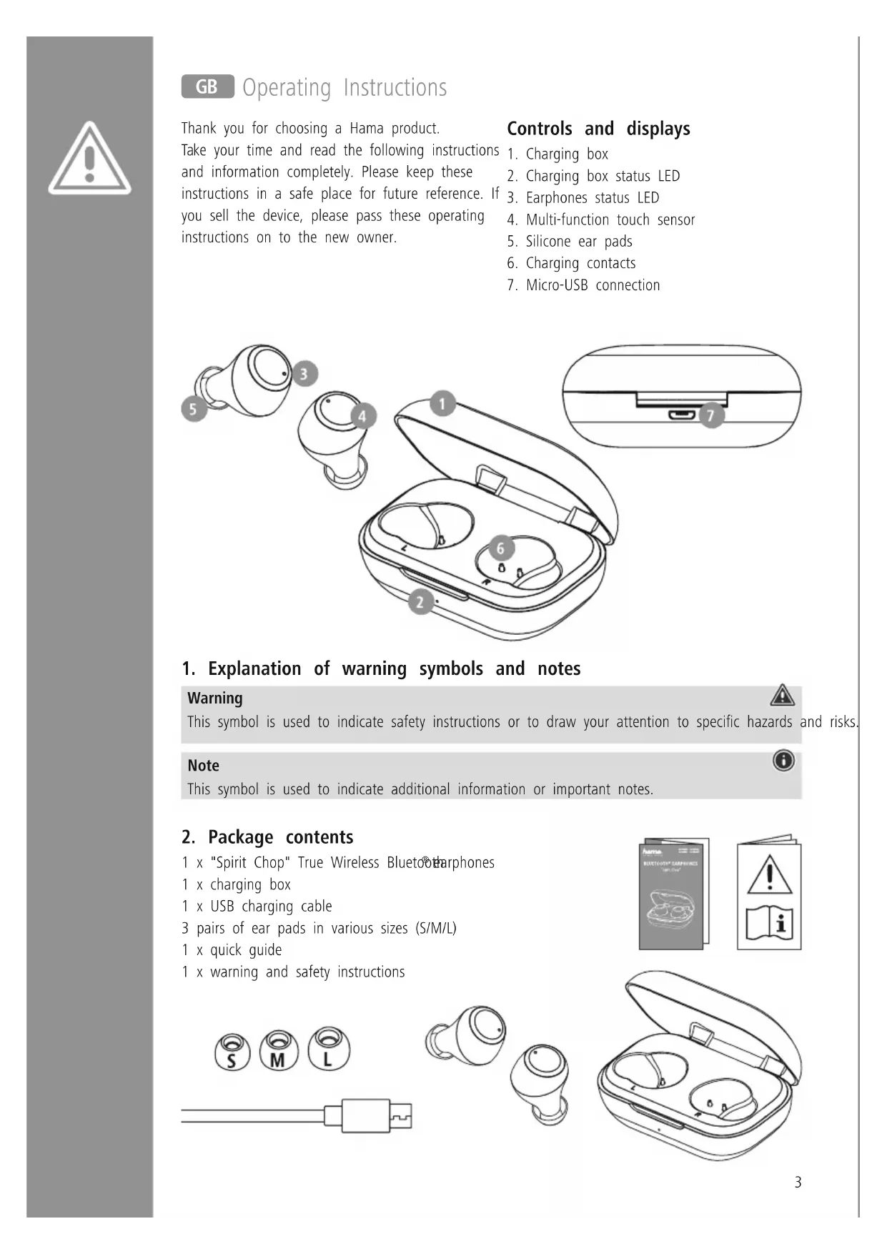 earphones 1 x charging box 1 x USB charging cable 3 pairs of ear pads in various sizes (S/M/L) 1 x quick guide 1 x warning and safety instructions G Operating Instructions4