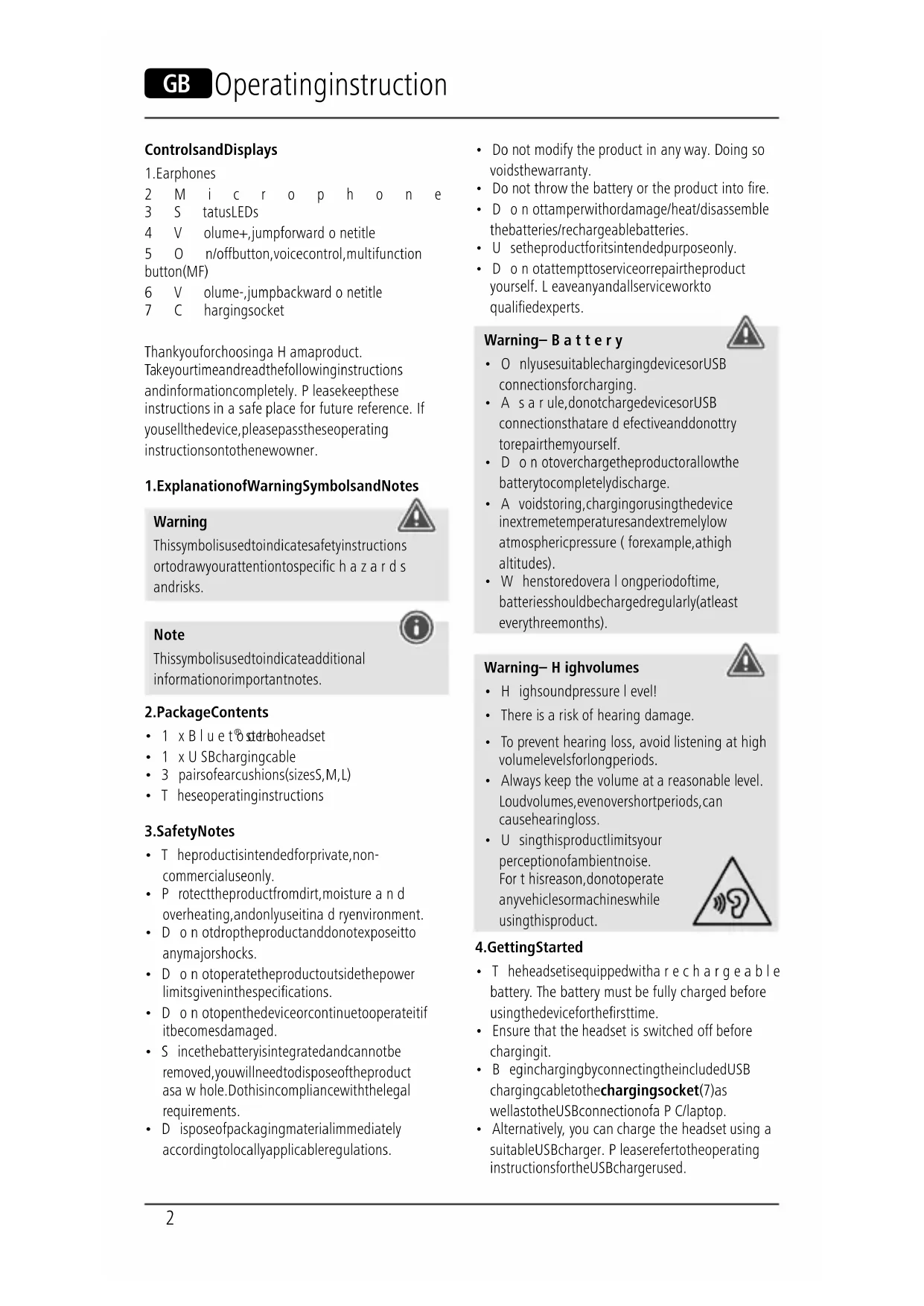 - The headset is equipped with arechargeable battery.The battery must be fully charged before using the device for the rst time.