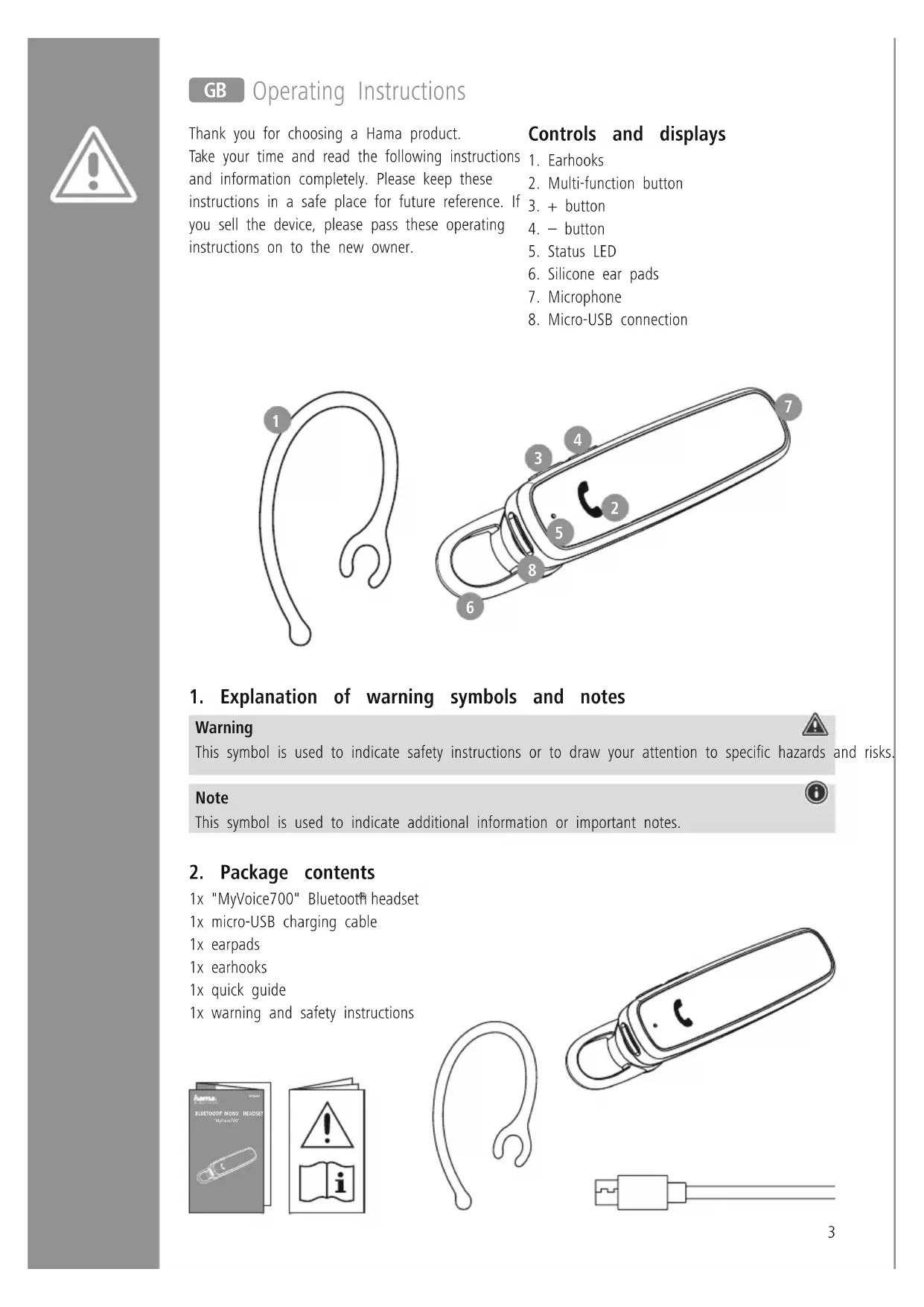 headset 1x micro-USB charging cable 1x earpads 1x earhooks 1x quick guide 1x warning and safety instructions BLUETOOTH