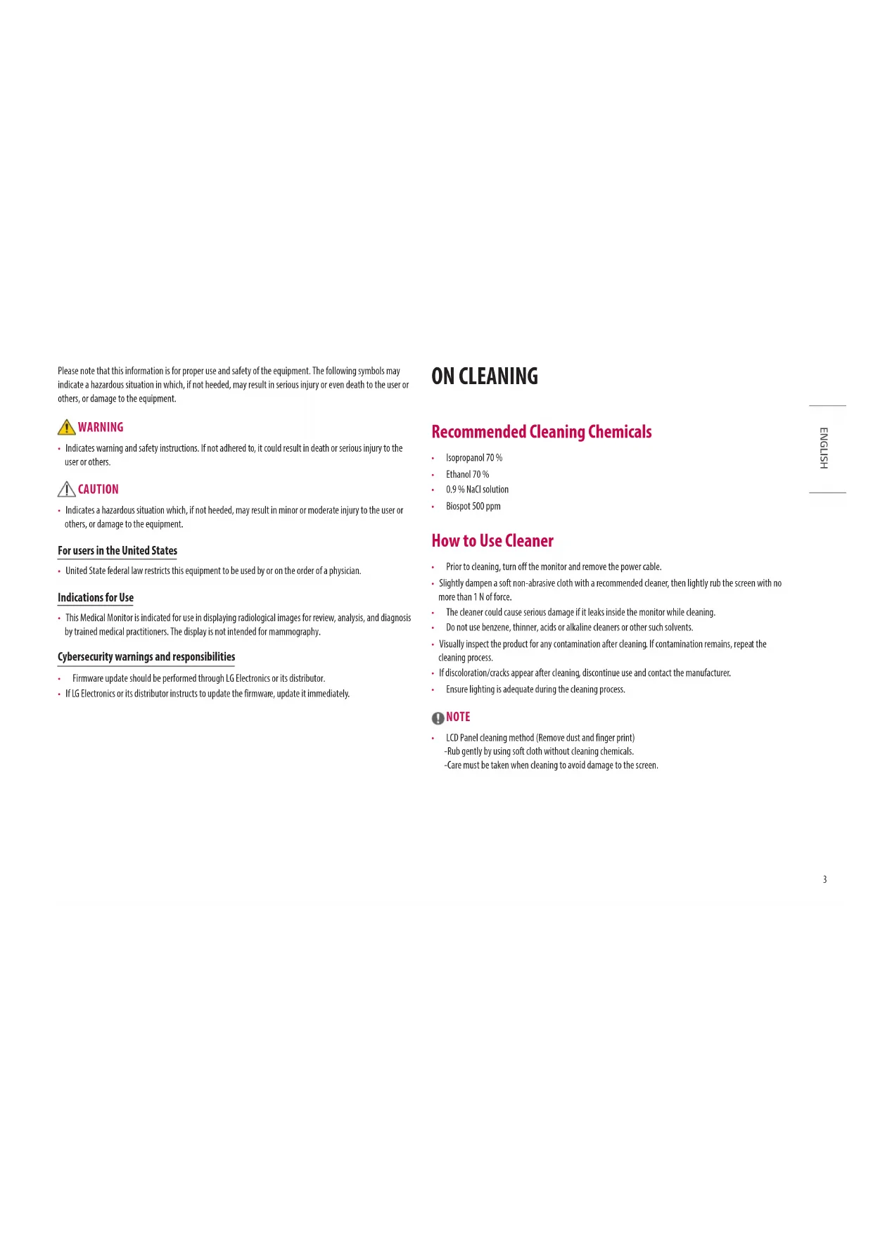- Periodically perform constancy tests. Calibrate if necessary. For details, refer to the User Manuals for the DBI Calibration Feedback System monitor quality control software. Calibration procedure Calibration Feedback System Calibration Feedback System (CFS) automatically detects the diagnostic or clinical displays to control. The integrated sensors on the displays is used. All test settings are preconfigured. A click of a button can initiate a Verification/check. A Recalibration can be started with a different button click. Reports are auto generated. Built-in QC/QA Wizards can be initiated to run a group of tests. For further details using CFS, please see the Help icon in the upper right corner of CFS which can guide users interactively. Maintenance schedule Calibration Feedback System Upon installation, Calibration Feedback System (CFS) is preconfigured for target luminance levels and test schedules. A simple manual Re-Adjust of the target level can be initiated with a click of a button. This can then be followed by a Verification or Check, also by the click of a button. QC/QA Wizards can also be scheduled based on the day the test was first run. These are predetermined schedule times based on industry standards and regional requirements. For further details using CFS, please see the Help icon in the upper right corner of CFS which can guide users interactively.43 ENGLISH Performance specifications We perform the physical laboratory test according to the ‘Display Devices for Diagnostic Radiology – Guidance for Industry and Food and Drug Administration Staff’ like below and we set the acceptance criteria for the physical laboratory test, the product was all passed according to the criteria. Test detail 1 Spatial resolution - Measurements of the transfer of information from the image data to the luminance fields at different spatial frequencies of interest typically done by reporting the modulation transfer function. 2 Pixel defects - Measurements (count, types (e.g., sub-pixel or entire pixel), always-on, always-off), and locations (map) of pixel defects. 3 Artifacts - Evaluate for image artifacts such as ghosting and/or image sticking from displaying a fixed test pattern for a period of time. 4 Temporal response - Measurements of the temporal behavior of the display in responding to changes in image values from frame to frame. 5 Luminance (achievable and recommended) - Measurements of the luminance that the device outputs as used in the application under recommended conditions and the achievable values if the device is set to expand the range to the limit. 6 Conformance to a grayscale-to-luminance function (e.g., DICOM GSDF) - Measurements of the mapping between image values and the luminance output following a target model response for 256 or more levels. 7 Color tracking - Chromaticity at different luminance levels of gray shades, including the white point, as indicated by the color coordinates in an appropriate units system44 ENGLISH LIMITED WARRANTY (USA) THE PRODUCT’S FULL LIMITED WARRANTY TERMS AND CONDITIONS ARE AVAILABLE AT https://www.lg.com/us AND/OR YOUR WARRANTY. ARBITRATION NOTICE: THIS LIMITED WARRANTY CONTAINS AN ARBITRATION PROVISION THAT REQUIRES YOU AND LG ELECTRONICS (“LG”) TO RESOLVE DISPUTES BY BINDING ARBITRATION INSTEAD OF IN COURT, UNLESS YOU CHOOSE TO OPT OUT. IN ARBITRATION, CLASS ACTIONS AND JURY TRIALS ARE NOT PERMITTED. PLEASE SEE THE SECTION TITLED “PROCEDURE FOR RESOLVING DISPUTES” BELOW. PROCEDURE FOR RESOLVING DISPUTES: ALL DISPUTES BETWEEN YOU AND LG ARISING OUT OF OR RELATING IN ANY WAY TO THIS LIMITED WARRANTY OR THE PRODUCT SHALL BE RESOLVED EXCLUSIVELY THROUGH BINDING ARBITRATION, AND NOT IN A COURT OF GENERAL JURISDICTION. BINDING ARBITRATION MEANS THAT YOU AND LG ARE EACH WAIVING THE RIGHT TO A JURY TRIAL AND TO BRING OR PARTICIPATE IN A CLASS ACTION. Definitions. For the purposes of this section, references to “LG” mean LG Electronics U.S.A., Inc., its parents, subsidiaries and affiliates, and each of their officers, directors, employees, agents, beneficiaries, predecessors in interest, successors, assigns and suppliers; references to “dispute” or “claim” shall include any dispute, claim or controversy of any kind whatsoever (whether based in contract, tort, statute, regulation, ordinance, fraud, misrepresentation or any other legal or equitable theory) arising out of or relating in any way to the sale, condition or performance of the product or this Limited Warranty. Notice of Dispute. In the event you intend to commence an arbitration proceeding, you must first notify LG in writing at least 30 days in advance of initiating the arbitration by sending a letter to LG at LG Electronics, USA, Inc. Attn: Legal Department- Arbitration 111 Sylvan Avenue, Englewood Cliffs, NJ 07632. You and LG agree to engage in good faith discussions in an attempt to amicably resolve your claim. The notice must provide your name, address, and telephone number; identify the product that is the subject of the claim; and describe the nature of the claim and the relief being sought. If you and LG are unable to resolve the dispute within 30 days, either party may proceed to file a claim for arbitration. Agreement to Binding Arbitration and Class Action Waiver. Upon failure to resolve the dispute during the 30 day period after sending written notice to LG, you and LG agree to resolve any claims between us only by binding arbitration on an individual basis, unless you opt out as provided below. Any dispute between you and LG shall not be combined or consolidated with a dispute involving any other person’s or entity’s product or claim. More specifically, without limitation of the foregoing, any dispute between you and LG shall not under any circumstances proceed as part of a class or representative action. Instead of arbitration, either party may bring an individual action in small claims court, but that small claims court action may not be 