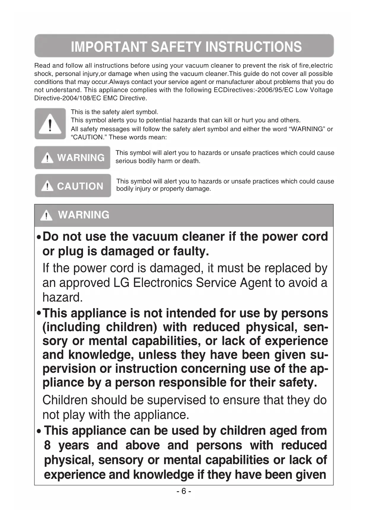 Do not use the vacuum cleaner if the power cord or plug is damaged or faulty. If the power cord is damaged, it must be replaced by an approved LG Electronics Service Agent to avoid a hazard. This appliance is not intended for use by persons (including children) with reduced physical, sen- sory or mental capabilities, or lack of experience and knowledge, unless they have been given su- pervision or instruction concerning use of the ap- pliance by a person responsible for their safety. Children should be supervised to ensure that they do not play with the appliance. This appliance can be used by children aged from 8 years and above and persons with reduced physical, sensory or mental capabilities or lack of experience and knowledge if they have been given - 6 -• Do not plug in if control knob is not in OFF position. Personal injury or product damage could result.(Depending on model)