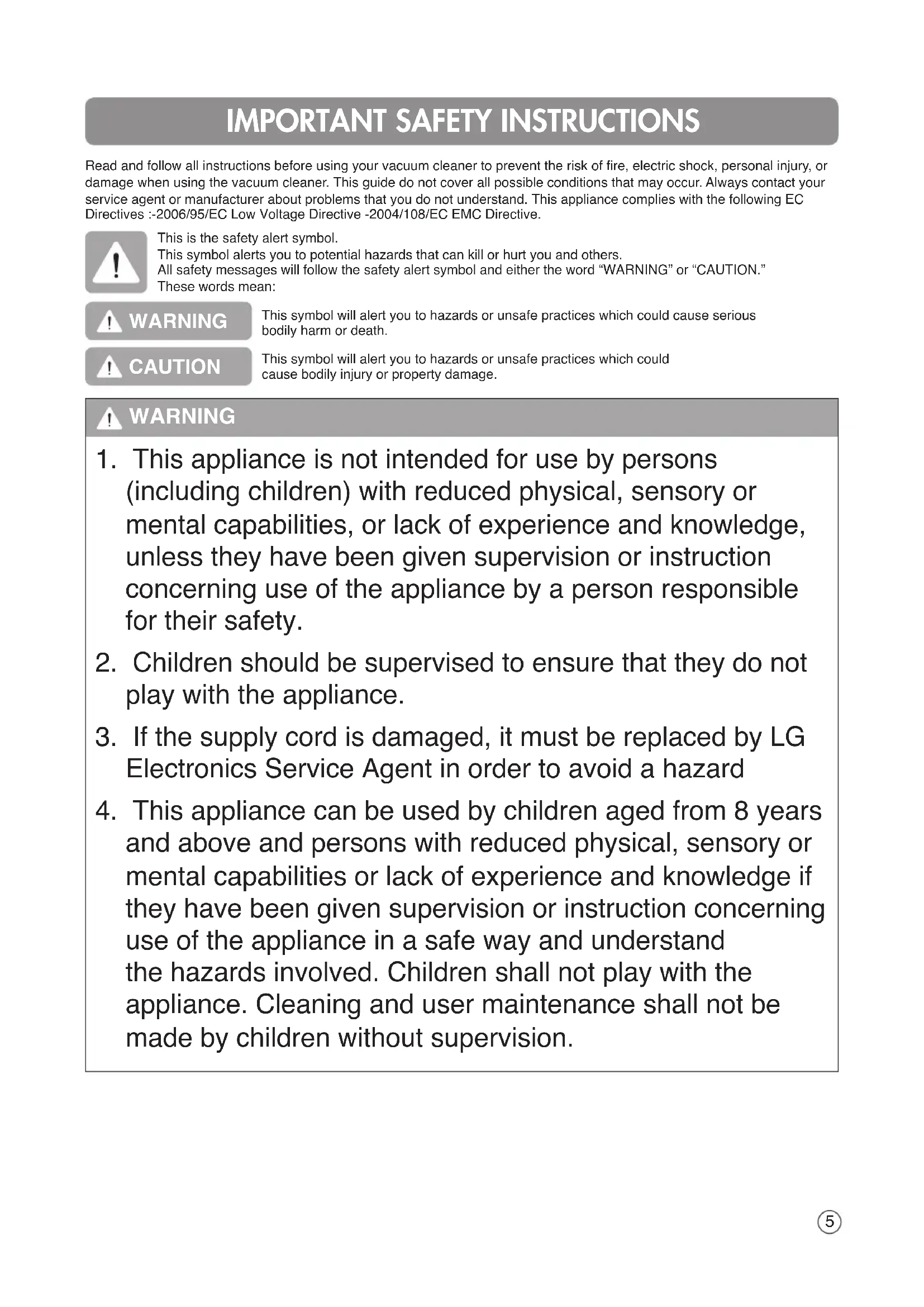 - Do not use vacuum cleaner if it has been under water. Personal injury or product damage could result. In these cases, contact LG Electronics Service Agent to avoid hazard.