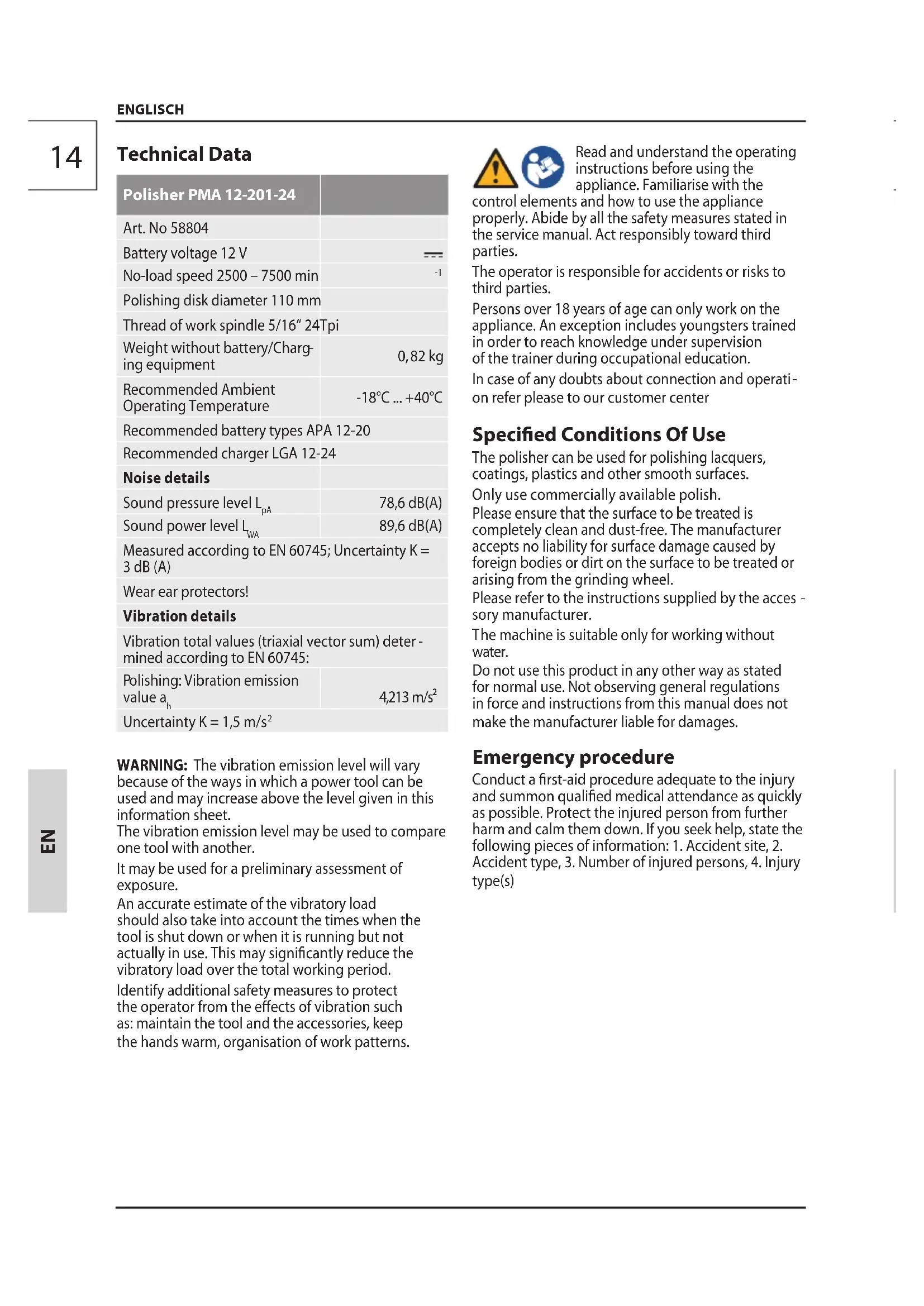 because of the ways in which a power tool can be used and may increase above the level given in this information sheet. The vibration emission level may be used to compare one tool with another. It may be used for a preliminary assessment of exposure. An accurate estimate of the vibratory load shouldalso take into account the times when the tool isshut down or when it is running but not actually inuse. This may signicantly reduce the vibratoryload over the total working period. Identify additional safety measures to protect theoperator from the eects of vibration such as:maintain the tool and the accessories, keep thehands warm, organisation of work patterns. Read and understand the operating instructions before using the appliance. Familiarise with the control elements and how to use the appliance properly. Abide by all the safety measures stated in the service manual. Act responsibly toward third parties. The operator is responsible for accidents or risks to third parties. Persons over 18 years of age can only workon the appliance.An exception includes youngsters trained in order to reachknowledge under supervision of the trainer duringoccupational education. In case of any doubts about connection and operati