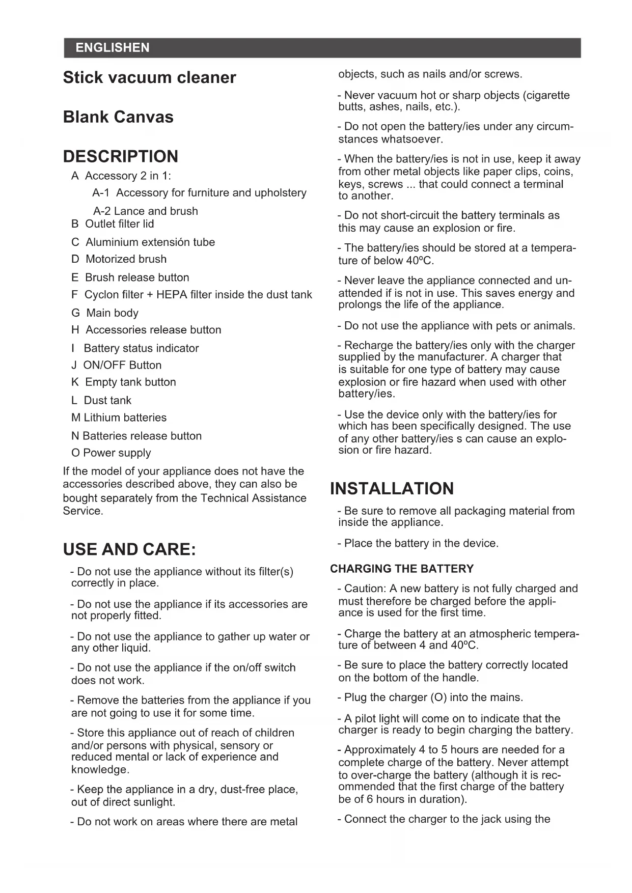 VEZ FINALIZADA LA VIDA DEL APARATO, PROCEDER COMO SIGUE: - Presionar el botón de extracción de la batería y estirar la batería fuera del cuerpo del aspira- dor. (Fig. 8)ENGLISH EN Stick vacuum cleaner Blank Canvas DESCRIPTION A Accessory 2 in 1: A-1 Accessory for furniture and upholstery A-2 Lance and brush B Outlet lter lid C Aluminium extensión tube D Motorized brush E Brush release button F Cyclon lter + HEPA lter inside the dust tank G Main body H Accessories release button I Battery status indicator J ON/OFF Button K Empty tank button L Dust tank M Lithium batteries N Batteries release button O Power supply If the model of your appliance does not have the accessories described above, they can also be bought separately from the Technical Assistance Service. USE AND CARE: - Do not use the appliance without its lter(s) correctly in place. - Do not use the appliance if its accessories are not properly tted. - Do not use the appliance to gather up water or any other liquid. - Do not use the appliance if the on/off switch does not work. - Remove the batteries from the appliance if you are not going to use it for some time. - Store this appliance out of reach of children and/or persons with physical, sensory or reduced mental or lack of experience and knowledge. - Keep the appliance in a dry, dust-free place, out of direct sunlight. - Do not work on areas where there are metal objects, such as nails and/or screws. - Never vacuum hot or sharp objects (cigarette butts, ashes, nails, etc.). - Do not open the battery/ies under any circum- stances whatsoever. - When the battery/ies is not in use, keep it away from other metal objects like paper clips, coins, keys, screws ... that could connect a terminal to another. - Do not short-circuit the battery terminals as this may cause an explosion or re. - The battery/ies should be stored at a tempera- ture of below 40ºC. - Never leave the appliance connected and un- attended if is not in use. This saves energy and prolongs the life of the appliance. - Do not use the appliance with pets or animals. - Recharge the battery/ies only with the charger supplied by the manufacturer. A charger that is suitable for one type of battery may cause explosion or re hazard when used with other battery/ies. - Use the device only with the battery/ies for which has been specically designed. The use of any other battery/ies s can cause an explo- sion or re hazard. INSTALLATION - Be sure to remove all packaging material from inside the appliance. - Place the battery in the device.
