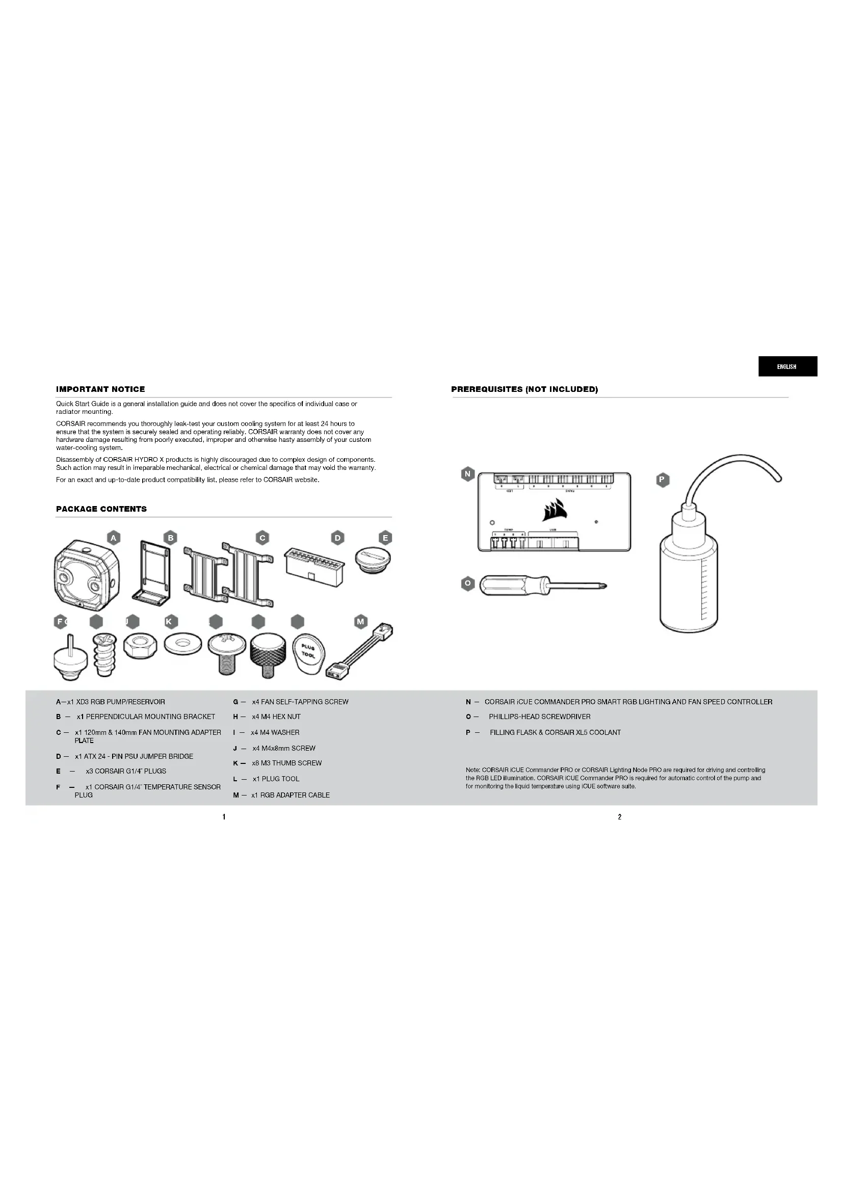 - PУССКИЙ 2 A — x1 XD3 RGB PUMP/RESERVOIR B — x1 PERPENDICULAR MOUNTING BRACKET C — x1 120mm & 140mm FAN MOUNTING ADAPTER PLATE D — x1 ATX 24 - PIN PSU JUMPER BRIDGE E — x3CORSAIRG1/4˝PLUGS F — x1CORSAIRG1/4˝TEMPERATURESENSOR PLUG G — x4 FAN SELF-TAPPING SCREW H — x4 M4 HEX NUT I — x4 M4 WASHER J — x4 M4x8mm SCREW K — x8 M3 THUMB SCREW L — x1 PLUG TOOL M — x1 RGB ADAPTER CABLE QuickStartGuideisageneralinstallationguideanddoesnotcoverthespecicsofindividualcaseor radiator mounting. CORSAIR recommends you thoroughly leak-test your custom cooling system for at least 24 hours to ensure that the system is securely sealed and operating reliably. CORSAIR warranty does not cover any hardware damage resulting from poorly executed, improper and otherwise hasty assembly of your custom water-cooling system. Disassembly of CORSAIR HYDRO X products is highly discouraged due to complex design of components. Such action may result in irreparable mechanical, electrical or chemical damage that may void the warranty. For an exact and up-to-date product compatibility list, please refer to CORSAIR website. IMPORTANT NOTICE PACKAGE CONTENTS ENGLISH PREREQUISITES (NOT INCLUDED) N — CORSAIR iCUE COMMANDER PRO SMART RGB LIGHTING AND FAN SPEED CONTROLLER p. 511