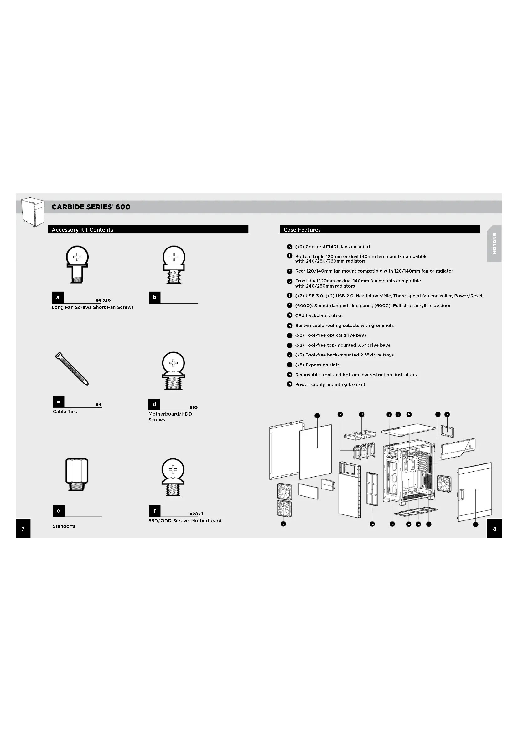 ENGLISH Case Features Accessory Kit Contents (x3) Corsair AF140L fans included Bottom triple 120mm or dual 140mm fan mounts compatible with 240/280/360mm radiators Rear 120/140mm fan mount compatible with 120/140mm fan or radiator Front dual 120mm or dual 140mm fan mounts compatible with 240/280mm radiators (x2) USB 3.0, (x2) USB 2.0, Headphone/Mic, Three-speed fan controller, Power/Reset (600Q): Sound-damped side panel; (600C): Full clear acrylic side door CPU backplate cutout Built-in cable routing cutouts with grommets (x2) Tool-free optical drive bays (x2) Tool-free top-mounted 3.5” drive bays (x3) Tool-free back-mounted 2.5” drive trays (x8) Expansion slots Removable front and bottom low restriction dust filters Power supply mounting bracket