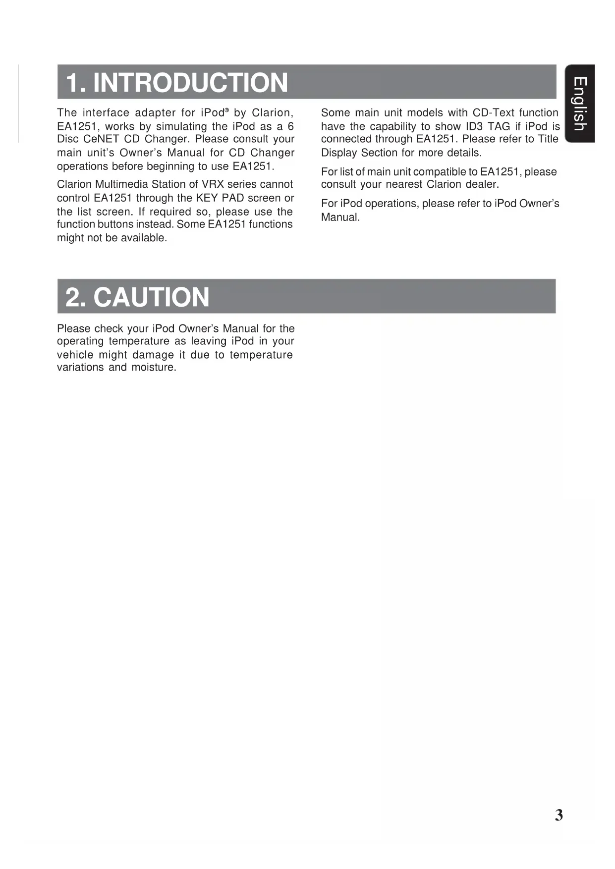Please check your iPod Owner’s Manual for the operating temperature as leaving iPod in your vehicle might damage it due to temperature variations and moisture. Some main unit models with CD-Text function have the capability to show ID3 TAG if iPod is connected through EA1251. Please refer to Title Display Section for more details. For list of main unit compatible to EA1251, please consult your nearest Clarion dealer. For iPod operations, please refer to iPod Owner’s Manual.4 English iPod, iPod mini Sold separately To DockconnectorTo iPodterminaliPod connection cable Included To CeNETconnectorCeNET compatibleMain Unit Sold separately To CeNETconnector Sold separately CeNET compatibleCD Changer Sold separately If user want to connect CD Changertogether, please change address switchto No.2Y-adaptor forMulti-changerconnection CCA-519