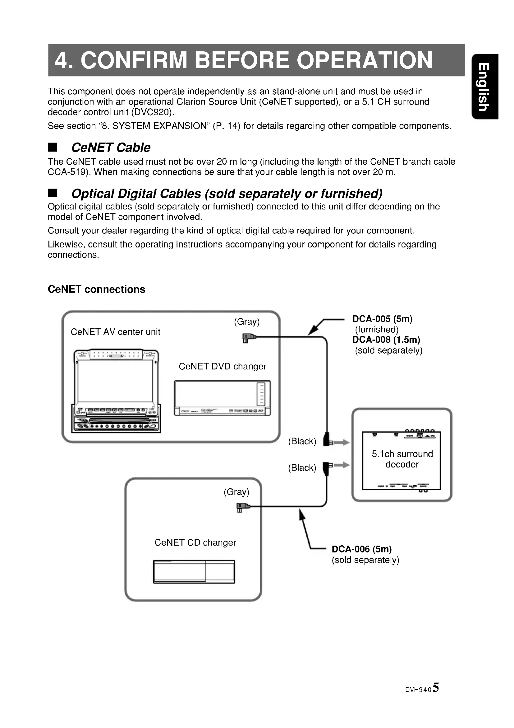 Optical Digital Cables (sold separately or furnished) Optical digital cables (sold separately or furnished) connected to this unit differ depending on themodel of CeNET component involved.Consult your dealer regarding the kind of optical digital cable required for your component.Likewise, consult the operating instructions accompanying your component for details regardingconnections. CeNET connections CeNET AV center unitCeNET DVD changer(Gray)DCA-005 (5m) (furnished)DCA-008 (1.5m) (sold separately)DCA-006 (5m)(sold separately)CeNET CD changer5.1ch surrounddecoder(Gray)(Black)(Black)6 DVH940 English