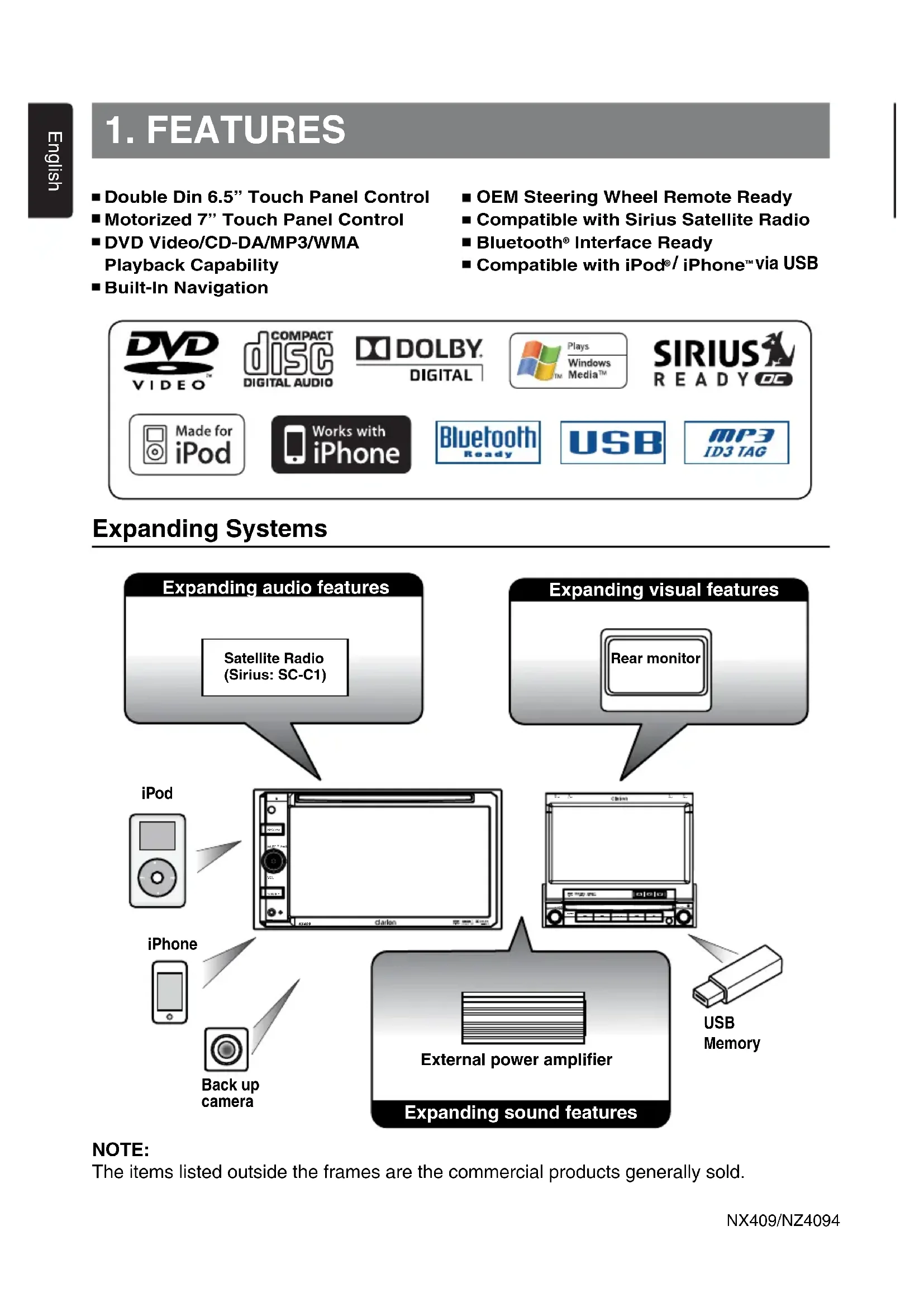 Expanding Systems Expanding audio features Expanding sound features External power amplifier NOTE: The items listed outside the frames are the commercial products generally sold. Double Din 6.5” Touch Panel Control Motorized 7” Touch Panel Control DVD Video/CD-DA/MP3/WMA Playback Capability Built-In Navigation OEM Steering Wheel Remote Ready Compatible with Sirius Satellite Radio Bluetooth