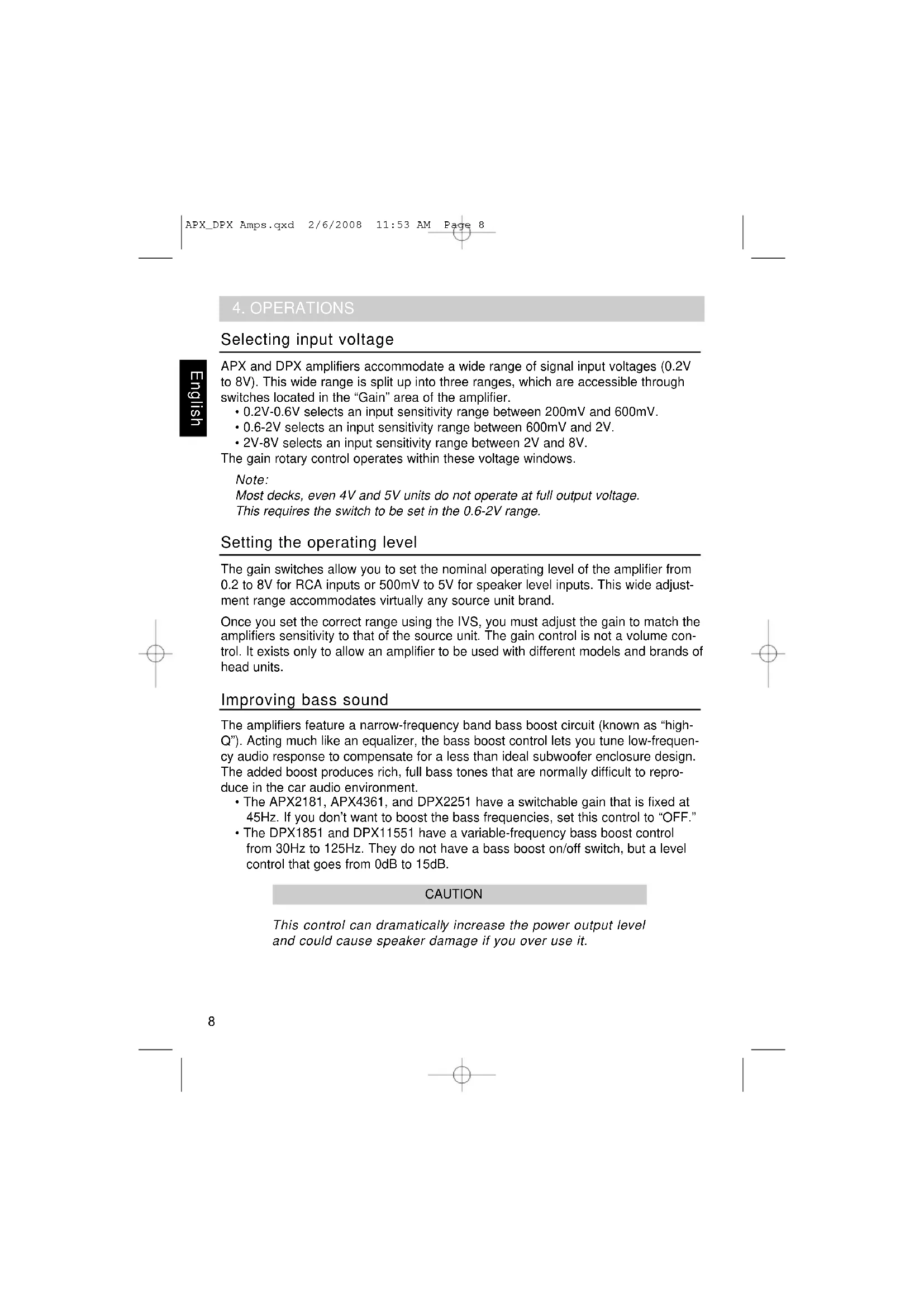 - The DPX1851 and DPX11551 have a variable-frequency bass boost control from 30Hz to 125Hz. They do not have a bass boost on/off switch, but a level control that goes from 0dB to 15dB. CAUTION This control can dramatically increase the power output level and could cause speaker damage if you over use it. APX_DPX Amps.qxd 2/6/2008 11:53 AM Page 8English