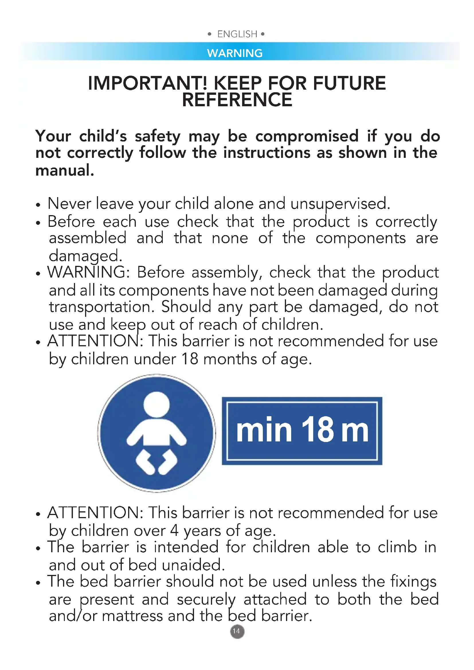 - The bed barrier should not be used unless the fixings are present and securely attached to both the bed and/or mattress and the bed barrier. min 18 m• ENGLISH •
