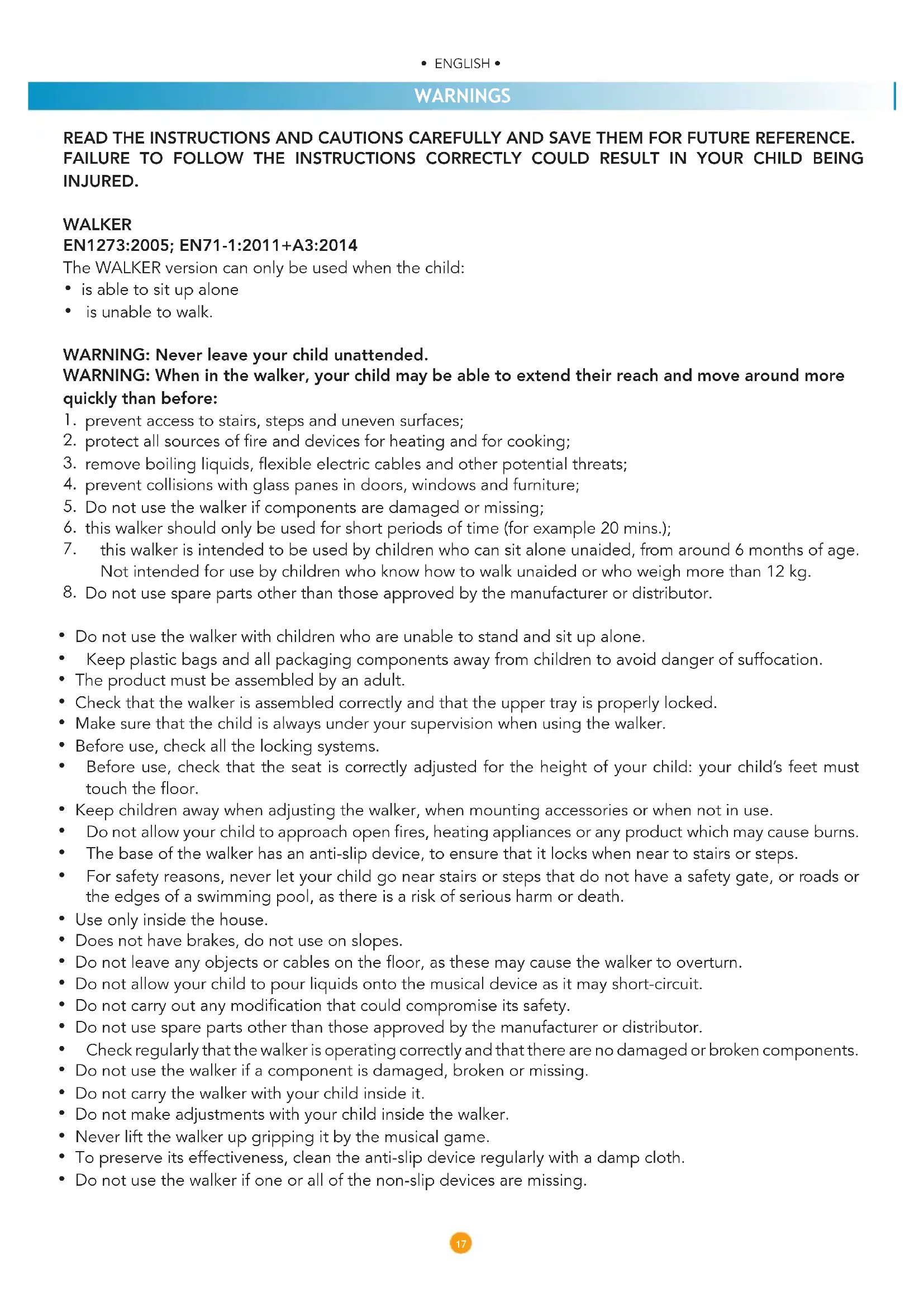 - Make sure that the child is always under your supervision when using the walker.