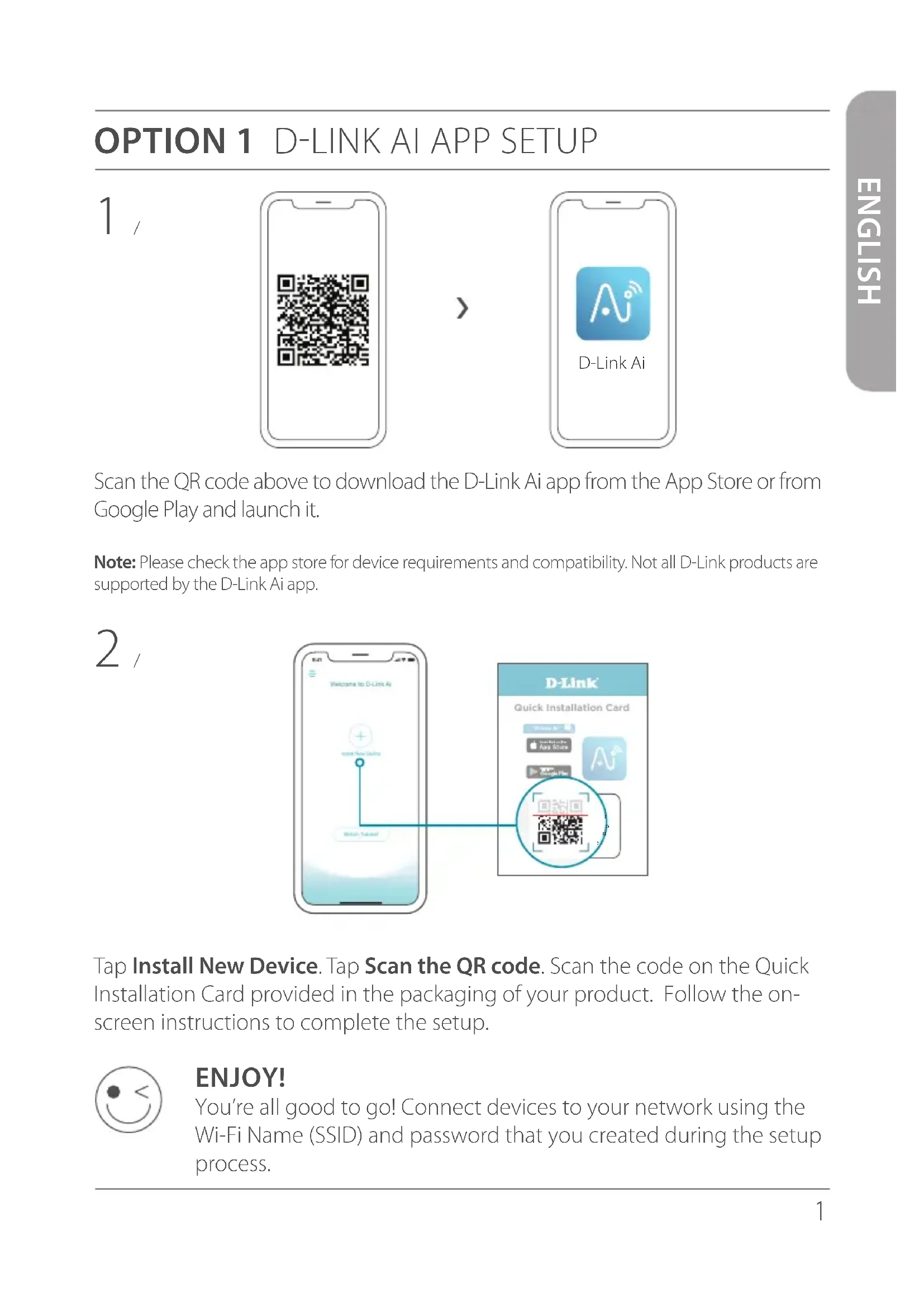 ENJOY! You’re all good to go! Connect devices to your network using the Wi-Fi Name (SSID) and password that you created during the setup process. D-Link AiQuick Installation Card “D-Link Ai ” Model Name: DEVICE Wi-Fi Name: E15-XXXX Password: XXXXXXXX