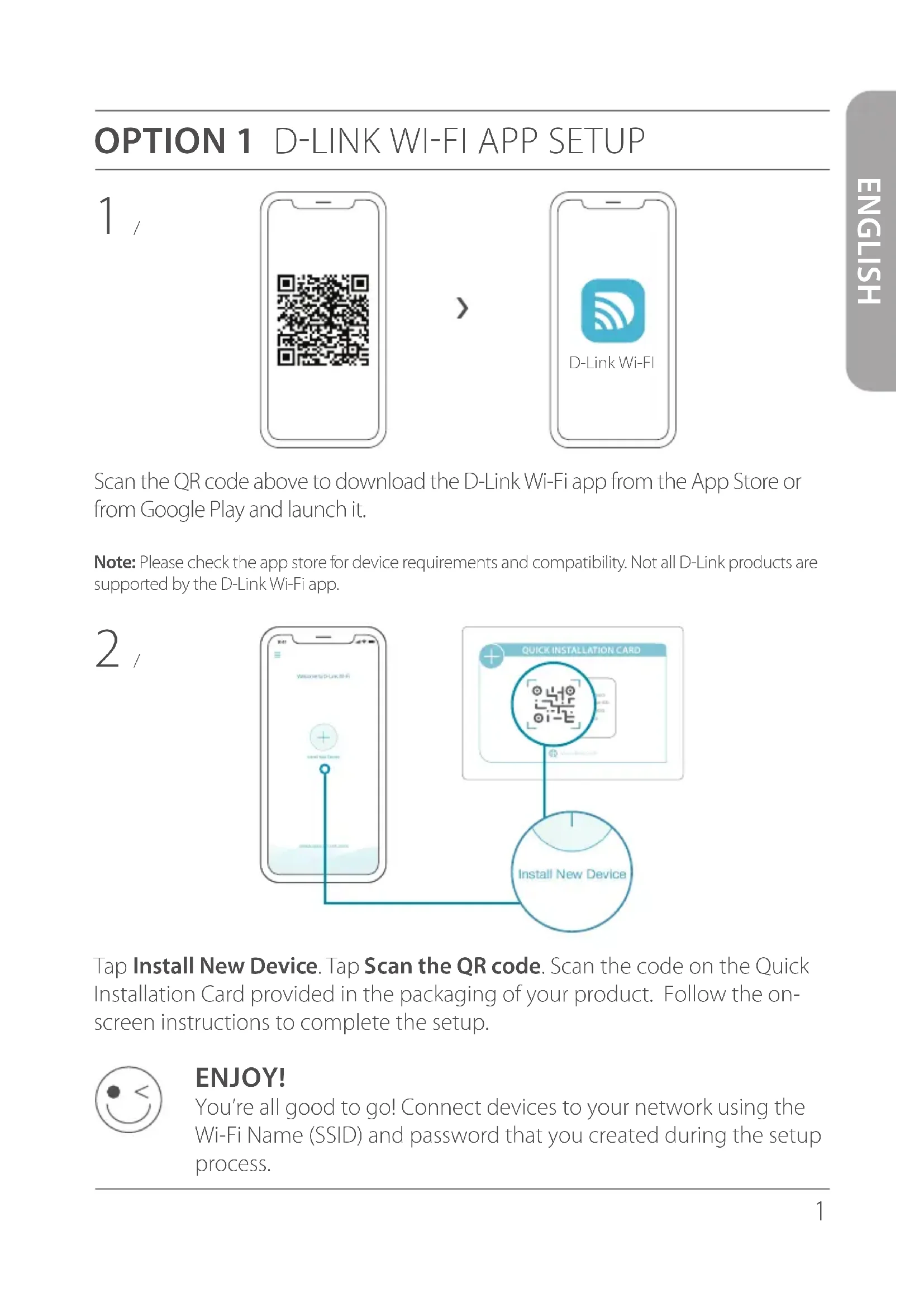 1 / Plug the extender into a power source close to your router. 2 / Wait for the Power LED of the extender to start blinking amber.Note: Please refer to the User Manual for device specific LED behaviour. < 1 m < 1 m3 ENGLISH ENJOY! You’re all good to go! Connect devices to your network using the Wi-Fi Name (SSID) and password that you created during the setup process. Type http://dlinkap.local./ into the address bar of a web browser. Follow the on-screen instructions to complete the setup. 4 / 3 / Connect your computer to the Wi-Fi name and password printed on the Quick Installation Card, or on the device label of the device.