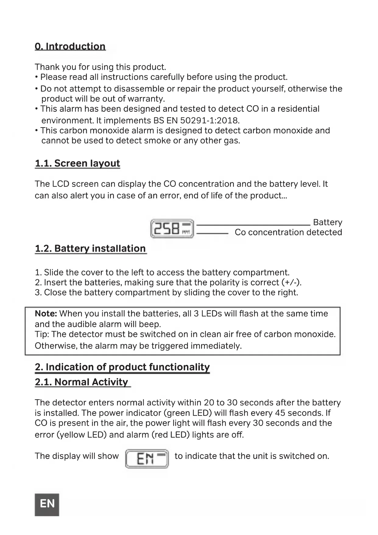 2.1. Normal Activity The detector enters normal activity within 20 to 30 seconds after the battery is installed. The power indicator (green LED) will ash every 45 seconds. If CO is present in the air, the power light will ash every 30 seconds and the error (yellow LED) and alarm (red LED) lights are o. The display will show to indicate that the unit is switched on. Battery Co concentration detected EN2.2. Alarm warning The alarm will not stop until the CO concentration is below 40 ppm. Place the detector in fresh air so that the alarm can be automatically stopped after 6 minutes, or you can simply stop the alarm by pressing the TEST button for 1 to 3 seconds. When the CO concentration is above 550 PPM, the display will show The red LED will ash 5 times with «beeps». The alarm will sound 3 times every 10 seconds. Note: When you hear successive beeps, this means a high concentration of CO. Please leave the room immediately and call for help. 2.3. Low CO warning When the CO concentration exceeds 30 ppm for more than 60 minutes, or when the CO concentration exceeds 40 ppm for more than 40 minutes, a low CO concentration warning is generated. The low CO concentration warning diers signicantly from the alarm warning: Low CO warning Alarm warning (high Co detection) Red LED ashes 4x and beeps at low speed. Repeats 1x every 3 to 5sec. The red LED ashes 5 times and beeps at high speed. The alarm sounds 3 times every 10sec. In daily life, low concentrations of carbon monoxide can often happen. For example, smoking a cigarette or burning a candle can produce low concentrations of CO. Although not dangerous, prolonged exposure can aect the health of vulnerable groups such as children, pregnant women or the elderly people. Note: This is not a dangerous situation, so don’t panic. 2.4. Low battery warning When the voltage falls below 3.6 V, a low battery warning is issued at least once a minute. On the display you can see the battery level in real time. The low battery notication will only be issued in case D. Note: The yellow LED will ash and you will hear a «beep» at least once a minute.