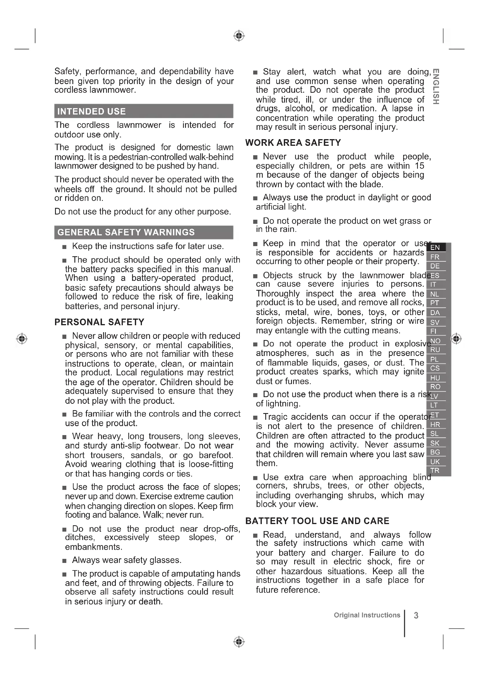 Original Instructions Safety, performance, and dependability have been given top priority in the design of your cordless lawnmower. INTENDED USE The cordless lawnmower is intended for outdoor use only. The product is designed for domestic lawn mowing. It is a pedestrian-controlled walk-behind lawnmower designed to be pushed by hand. The product should never be operated with the wheels off the ground. It should not be pulled or ridden on. Do not use the product for any other purpose.