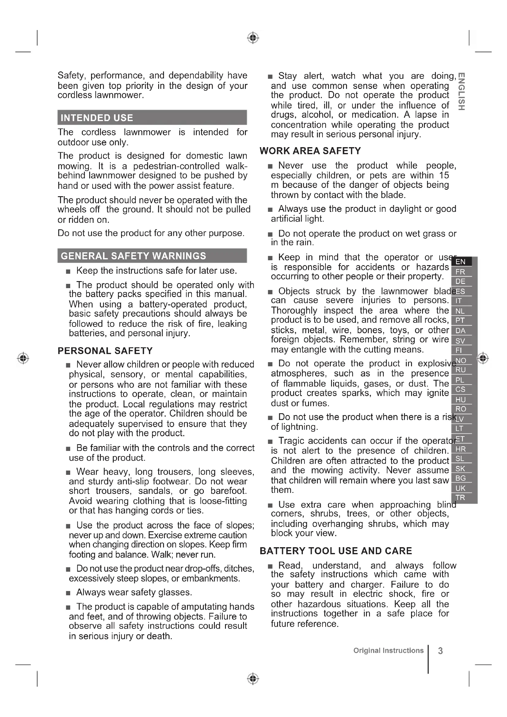 Original Instructions Safety, performance, and dependability have been given top priority in the design of your cordless lawnmower. INTENDED USE The cordless lawnmower is intended for outdoor use only. The product is designed for domestic lawn mowing. It is a pedestrian-controlled walk- behind lawnmower designed to be pushed by hand or used with the power assist feature. The product should never be operated with the wheels off the ground. It should not be pulled or ridden on. Do not use the product for any other purpose.