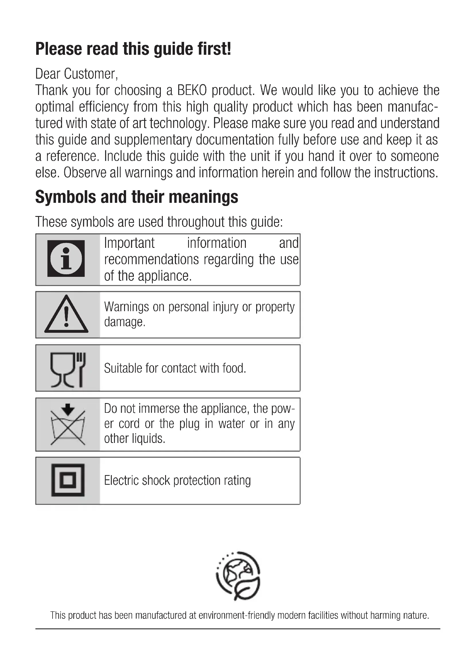 ARABIC 156-169Please read this guide first! Dear Customer, Thank you for choosing a BEKO product. We would like you to achieve the optimal efficiency from this high quality product which has been manufac- tured with state of art technology. Please make sure you read and understand this guide and supplementary documentation fully before use and keep it as a reference. Include this guide with the unit if you hand it over to someone else. Observe all warnings and information herein and follow the instructions. Symbols and their meanings These symbols are used throughout this guide: