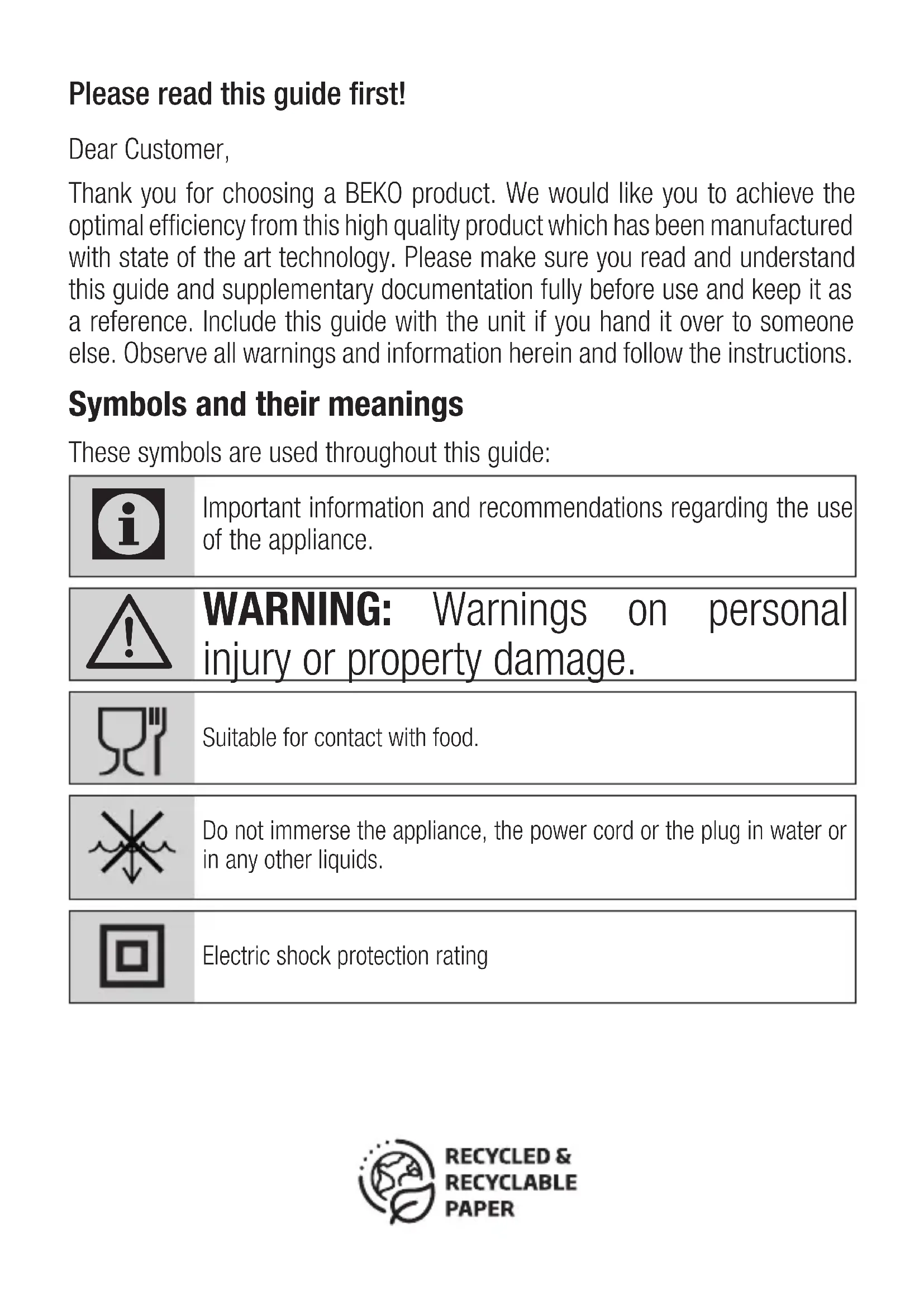 RUSSIAN 203-224Please read this guide first! Dear Customer,Thank you for choosing a BEKO product. We would like you to achieve the optimal efficiency from this high quality product which has been manufactured with state of the art technology. Please make sure you read and understand this guide and supplementary documentation fully before use and keep it as a reference. Include this guide with the unit if you hand it over to someone else. Observe all warnings and information herein and follow the instructions. Symbols and their meanings These symbols are used throughout this guide: Important information and recommendations regarding the use of the appliance.