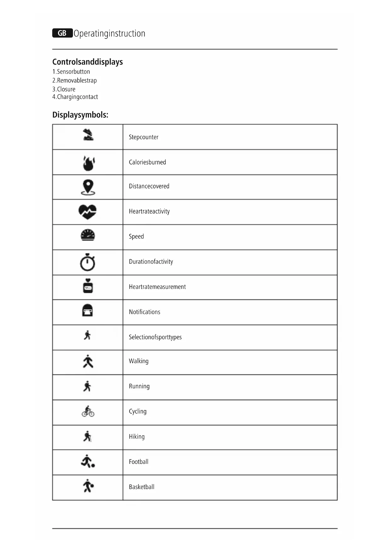 Display symbols: Step counter Calories burned Distance covered Heart rate activity Speed Duration of activity Heart rate measurement Notications Selection of sport types Walking Running Cycling Hiking Football BasketballVolleyball Strength training Badminton Tennis Table tennis Bowling Baseball Badminton Treadmill Aerobics Yoga Spinning Skiing Skating Push-ups Skipping Climbing DancingStopwatch Cameraremote trigger Selection of dial GPS