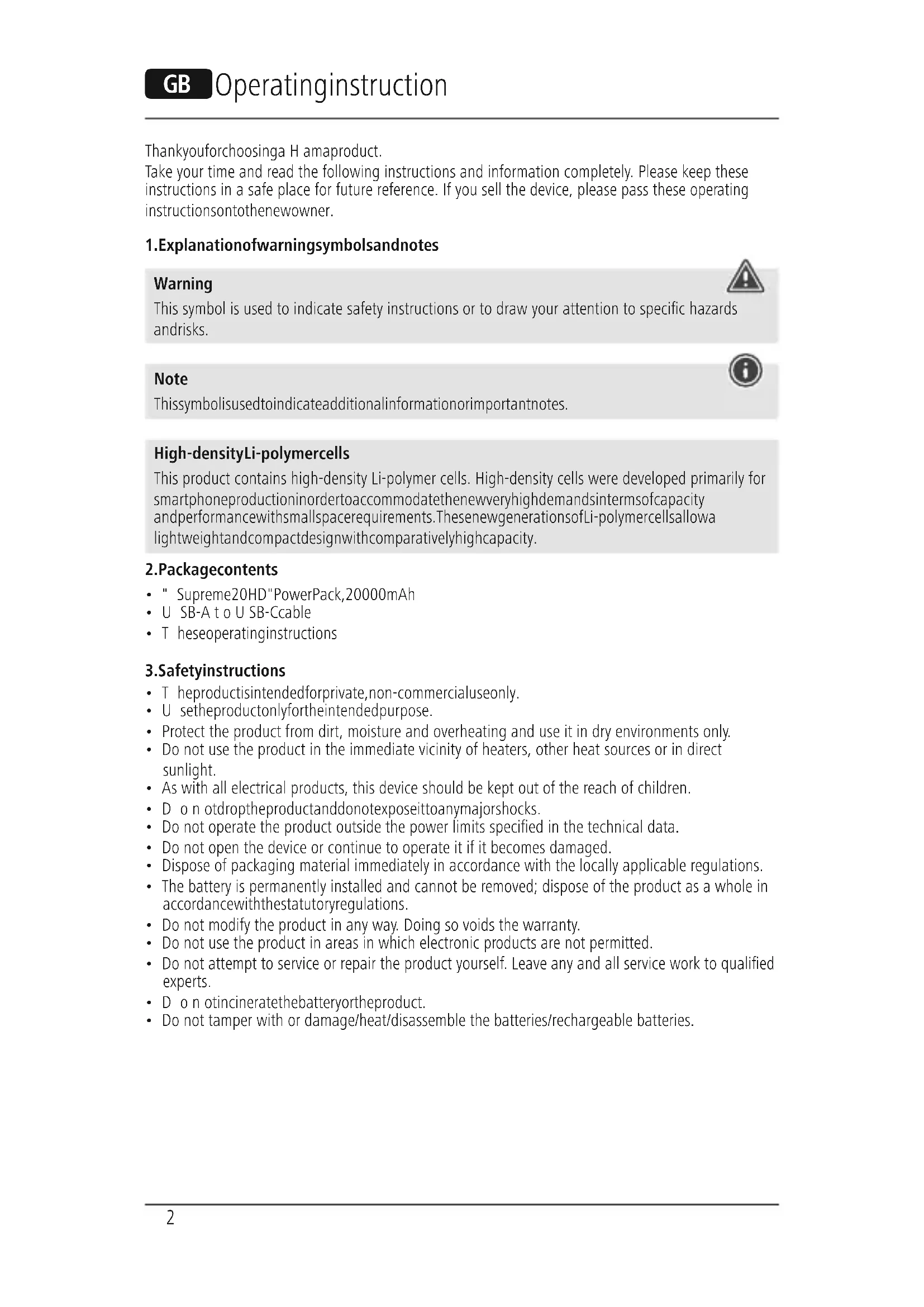 Warning This symbol is used to indicate safety instructions or to draw your attention to specichazards and risks. Note This symbol is used to indicate additional information or important notes. High-density Li-polymer cells This product contains high-density Li-polymer cells. High-density cells weredeveloped primarily for smartphone production in order to accommodate the new very high demands in terms of capacity and performance with small space requirements. These new generations of Li-polymer cells allow a lightweight and compact design with comparatively high capacity.
