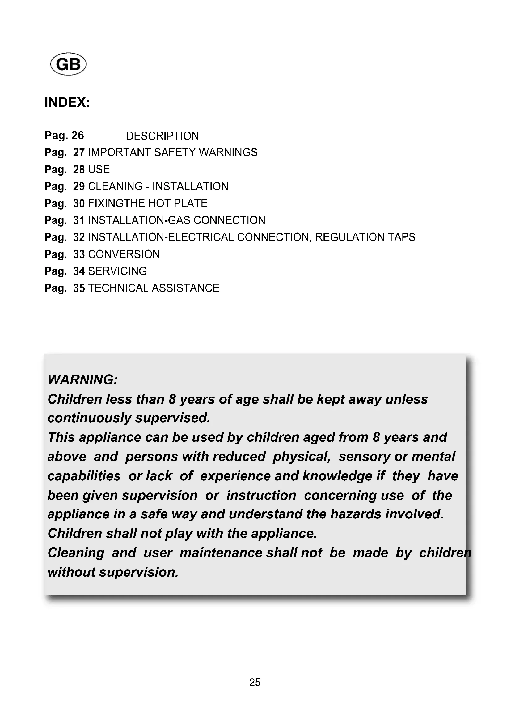 Children less than 8 years of age shall be kept away unless continuously supervised. This appliance can be used by children aged from 8 years and above and persons with reduced physical, sensory or mental capabilities or lack of experience and knowledge if they have been given supervision or instruction concerning use of the appliance in a safe way and understand the hazards involved. Children shall not play with the appliance. Cleaning and user maintenance shall not be made by children without supervision. INDEX: Pag. 26 DESCRIPTION Pag. 27 IMPORTANT SAFETY WARNINGS Pag. 28 USE Pag. 29 CLEANING - INSTALLATION Pag. 30 FIXINGTHE HOT PLATE Pag. 31 INSTALLATION-GAS CONNECTION Pag. 32 INSTALLATION-ELECTRICAL CONNECTION, REGULATION TAPS Pag. 33 CONVERSION Pag. 34 SERVICING Pag. 35 TECHNICAL ASSISTANCE26
