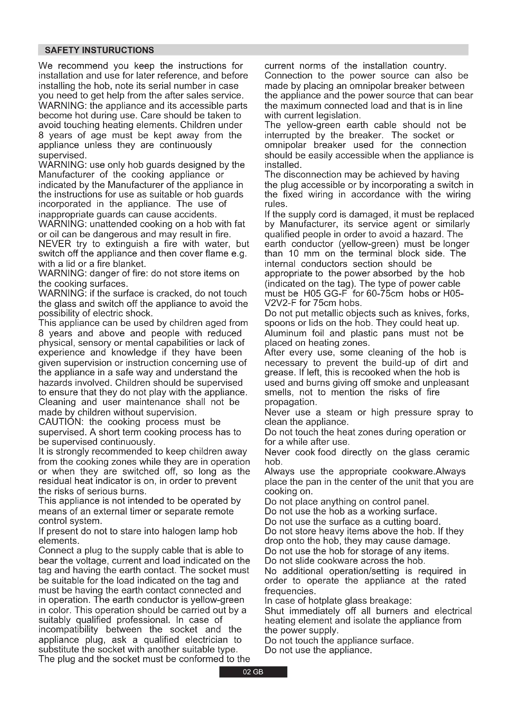 SK 6002 GB SAFETY INSTURUCTIONS We recommend you keep the instructions for installation and use for later reference, and before installing the hob, note its serial number in case you need to get help from the after sales service.