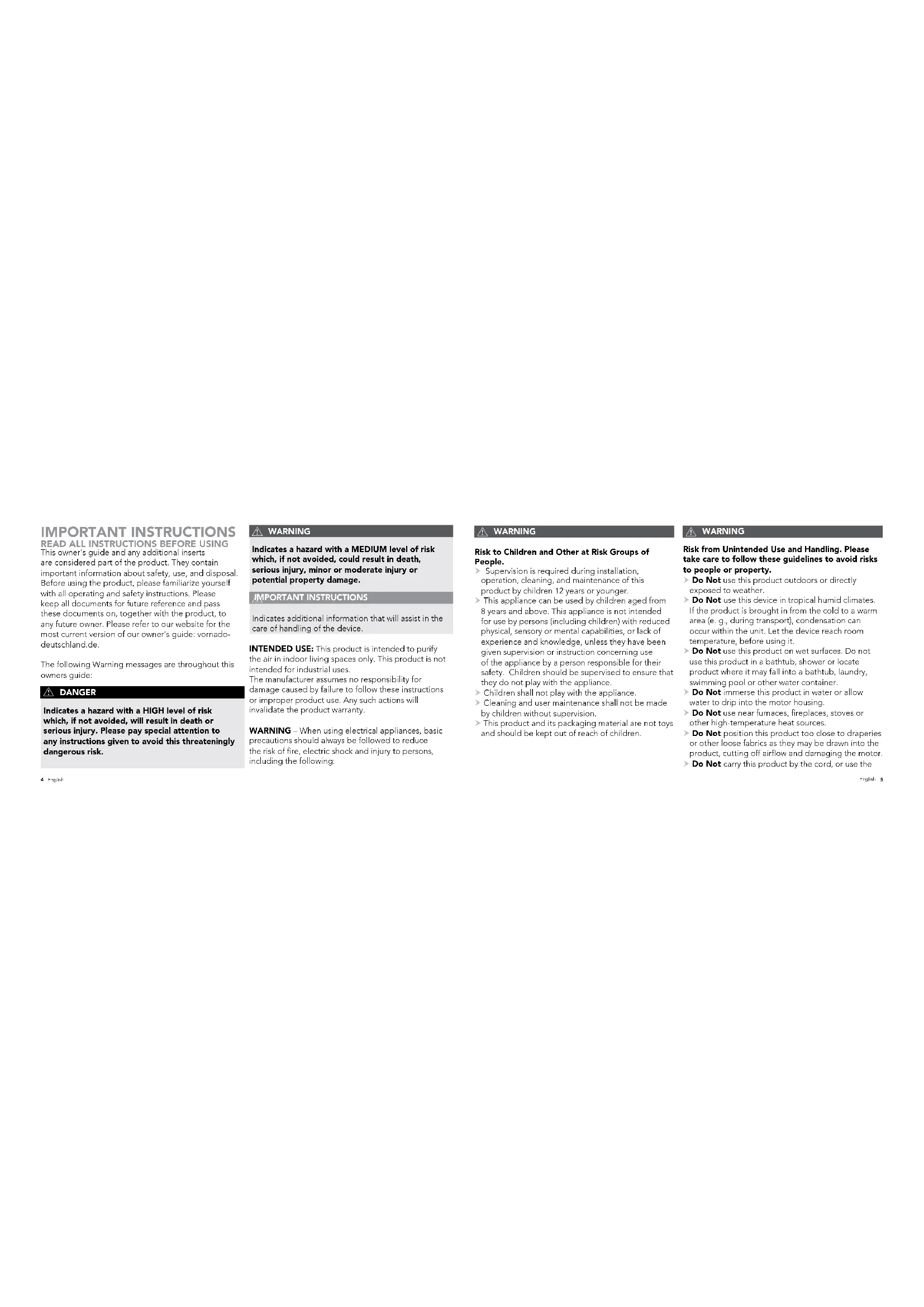 This owner's guide and any additional inserts are considered part of the product. They contain important information about safety, use, and disposal. Before using the product, please familiarize yourself with all operating and safety instructions. Please keep all documents for future reference and pass these documents on, together with the product, to any future owner. Please refer to our website for the most current version of our owner’s guide: vornado- deutschland.de. The following Warning messages are throughout this owners guide: DANGER Indicates a hazard with a HIGH level of risk which, if not avoided, will result in death or serious injury. Please pay special attention to any instructions given to avoid this threateningly dangerousrisk. WARNING Indicates a hazard with a MEDIUM level of risk which, if not avoided, could result in death, serious injury, minor or moderate injury or potential property damage. IMPORTANT INSTRUCTIONS Indicates additional information that will assist in the care of handling of the device. INTENDED USE: This product is intended to purify the air in indoor living spaces only. This product is not intended for industrial uses. The manufacturer assumes no responsibility for damage caused by failure to follow these instructions or improper product use. Any such actions will invalidate the product warranty. WARNING – When using electrical appliances, basic precautions should always be followed to reduce the risk of re, electric shock and injury to persons, including the following: IMPORTANT INSTRUCTIONS