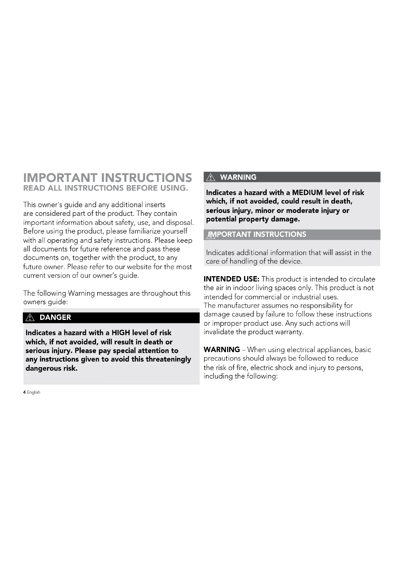 - Warranty Deutsch p. 17 Français p. 31 Nederlands p. 45 Italiano p. 60 Português p. 75 Español p. 90 Čeština p. 105 Svenska p. 120 Slovensky p. 1354 English This owner's guide and any additional inserts are considered part of the product. They contain important information about safety, use, and disposal. Before using the product, please familiarize yourself with all operating and safety instructions. Please keep all documents for future reference and pass these documents on, together with the product, to any future owner. Please refer to our website for the most current version of our owner’s guide. The following Warning messages are throughout this owners guide: DANGER Indicates a hazard with a HIGH level of risk which, if not avoided, will result in death or serious injury. Please pay special attention to any instructions given to avoid this threateningly dangerousrisk. WARNING Indicates a hazard with a MEDIUM level of risk which, if not avoided, could result in death, serious injury, minor or moderate injury or potential property damage. IMPORTANT INSTRUCTIONS Indicates additional information that will assist in the care of handling of the device. INTENDED USE: This product is intended to circulate the air in indoor living spaces only. This product is not intended for commercial or industrial uses. The manufacturer assumes no responsibility for damage caused by failure to follow these instructions or improper product use. Any such actions will invalidate the product warranty. WARNING – When using electrical appliances, basic precautions should always be followed to reduce the risk of re, electric shock and injury to persons, including the following: IMPORTANT INSTRUCTIONS p. 16