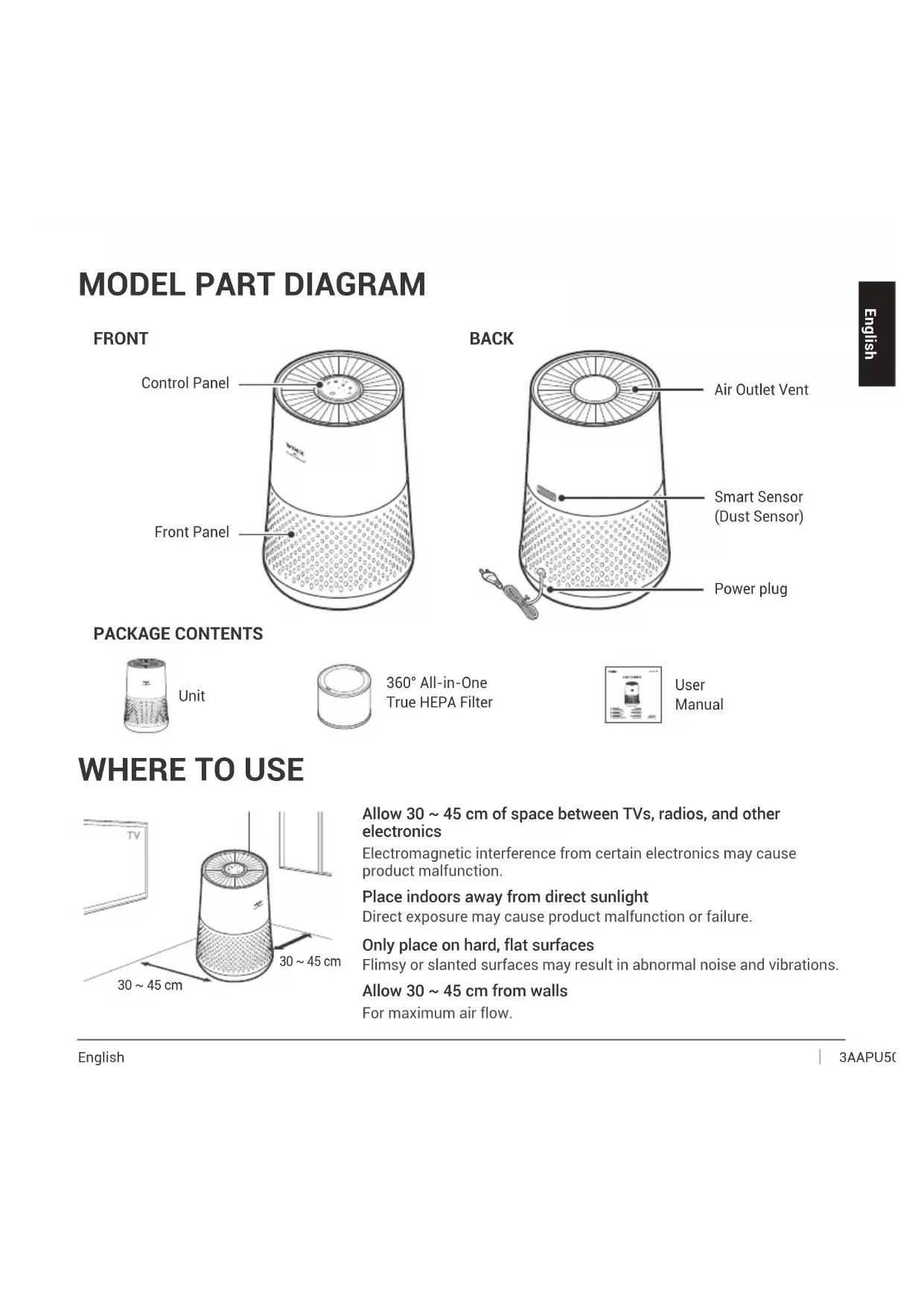 Allow 30 ~ 45 cm of space between TVs, radios, and other electronics Electromagnetic interference from certain electronics may cause product malfunction. Place indoors away from direct sunlight Direct exposure may cause product malfunction or failure. Only place on hard, flat surfaces Flimsy or slanted surfaces may result in abnormal noise and vibrations. Allow 30 ~ 45 cm from walls For maximum air flow. 30 ~ 45 cm30 ~ 45 cm FRONT Air Outlet Vent Smart Sensor (Dust Sensor) Power plug BACK PACKAGE CONTENTS Control Panel Front Panel Unit 360° All-in-One True HEPA Filter User Manual EnglishEnglish English 4 AAPU500-JLE
