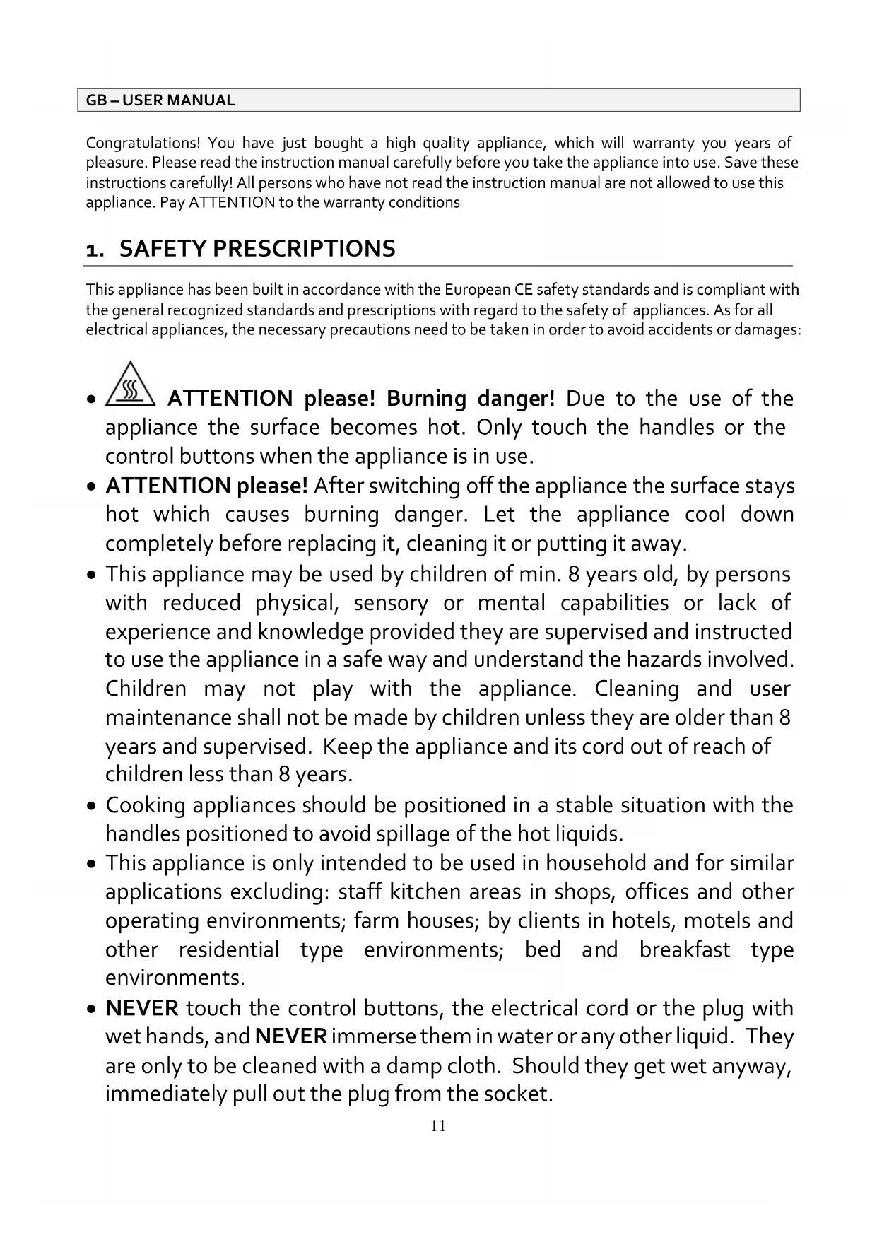 - ATTENTION please! Burning danger! Due to the use of the appliance the surface becomes hot. Only touch the handles or the control buttons when the appliance is in use.