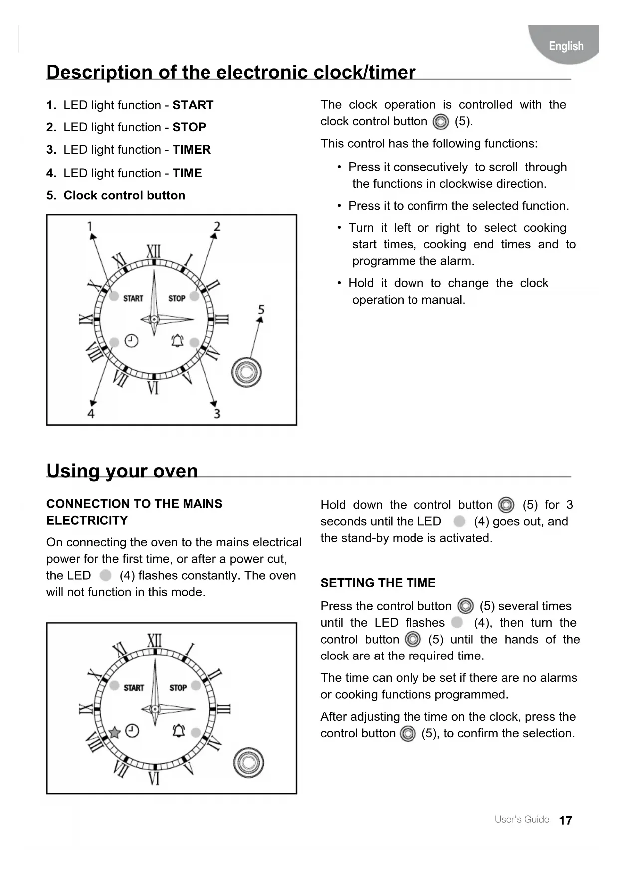 (5) until the hands of the clock are at the required time. The time can only be set if there are no alarms or cooking functions programmed. After adjusting the time on the clock, press the control button