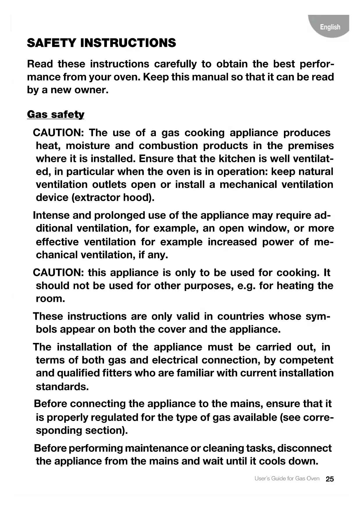 - This appliance is designed for cooking and heating food; do not use it for other purposes.27 User´s Guide for Gas Oven English Electrical safety