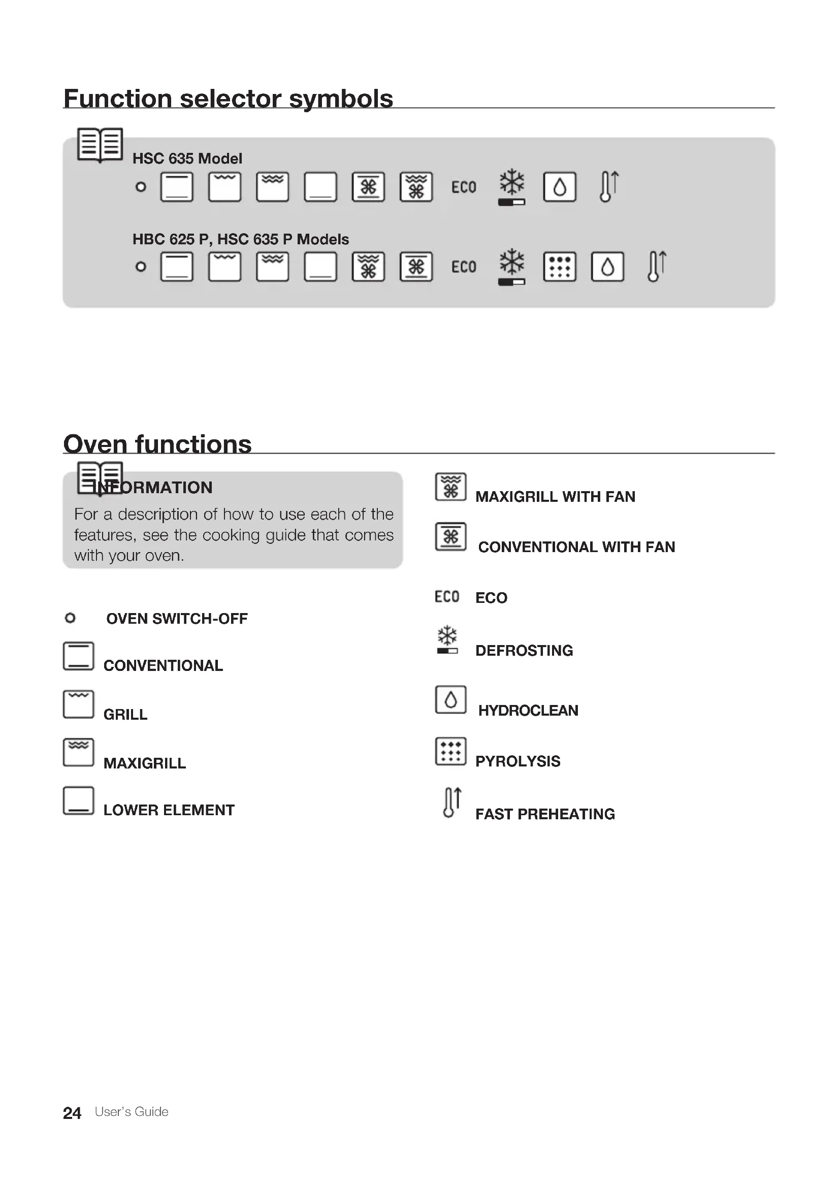 bottom of the oven.30 User’s Guide Pyrolytic self-cleaning function Function available in pyrolytic models HBC P / HSC P. WARNING Before setting the pyrolytic cleaning cycle, carefully read the safety instructions, which you will find at the start of the Installation and Maintenance guide. This function allows you to carry out a pyrolyt- ic cleaning cycle during which, due to the high temperatures reached inside the oven, accu-