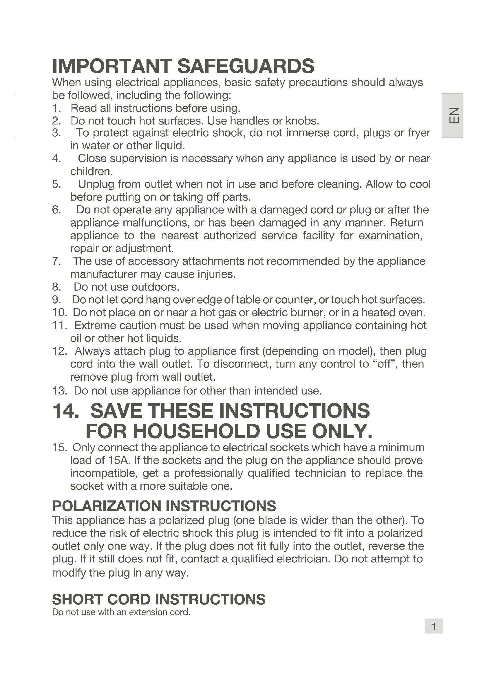 load of 15A. If the sockets and the plug on the appliance should prove incompatible, get a professionally qualied technician to replace the socket with a more suitable one. POLARIZATION INSTRUCTIONS This appliance has a polarized plug (one blade is wider than the other). To reduce the risk of electric shock this plug is intended to t into a polarized outlet only one way. If the plug does not t fully into the outlet, reverse the plug. If it still does not t, contact a qualied electrician. Do not attempt to modify the plug in any way.