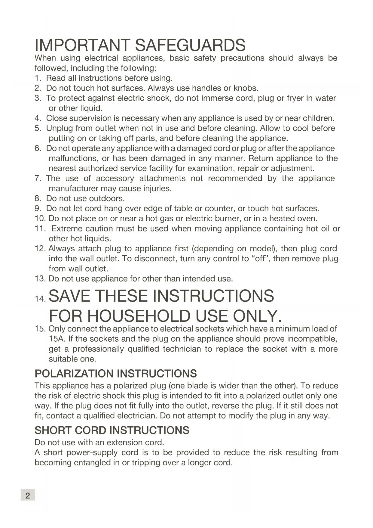 15A. If the sockets and the plug on the appliance should prove incompatible, get a professionally qualied technician to replace the socket with a more suitable one. POLARIZATION INSTRUCTIONS This appliance has a polarized plug (one blade is wider than the other). To reduce the risk of electric shock this plug is intended to t into a polarized outlet only one way. If the plug does not t fully into the outlet, reverse the plug. If it still does not t, contact a qualied electrician. Do not attempt to modify the plug in any way.