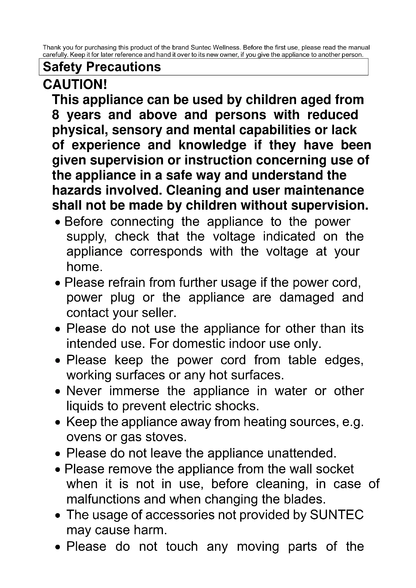 Spiral cutter SPI-8380 veggie noodle Instruction manualThank you for purchasing this product of the brand Suntec Wellness. Before the first use, please read the manual carefully. Keep it for later reference and hand it over to its new owner, if you give the appliance to another person. Safety Precautions CAUTION! This appliance can be used by children aged from 8 years and above and persons with reduced physical, sensory and mental capabilities or lack of experience and knowledge if they have been given supervision or instruction concerning use of the appliance in a safe way and understand the hazards involved. Cleaning and user maintenance shall not be made by children without supervision.