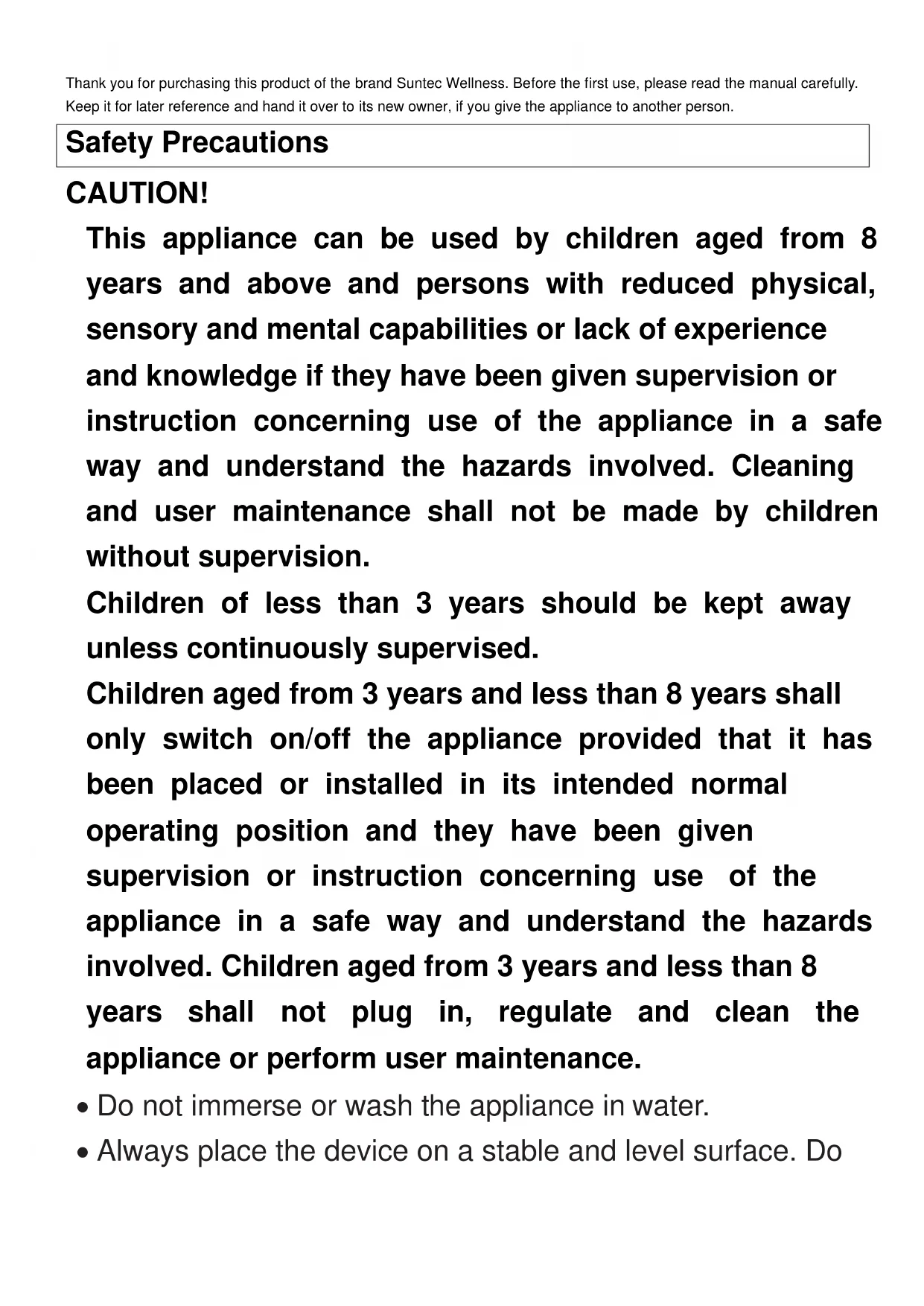 RKO-9974 SUNTEC WELLNESS GMBH / HOLZSTRASSE 2 / 40 221 DÜSSELDORF / DEUTSCHLANDRice cooker RKO-9974 Thùy-Denise Instruction ManualThank you for purchasing this product of the brand Suntec Wellness. Before the first use, please read the manual carefully. Keep it for later reference and hand it over to its new owner, if you give the appliance to another person. Safety Precautions CAUTION! This appliance can be used by children aged from 8 years and above and persons with reduced physical, sensory and mental capabilities or lack of experience and knowledge if they have been given supervision or instruction concerning use of the appliance in a safe way and understand the hazards involved. Cleaning and user maintenance shall not be made by children without supervision. Children of less than 3 years should be kept away unless continuously supervised. Children aged from 3 years and less than 8 years shall only switch on/off the appliance provided that it has been placed or installed in its intended normal operating position and they have been given supervision or instruction concerning use of the appliance in a safe way and understand the hazards involved. Children aged from 3 years and less than 8 years shall not plug in, regulate and clean the appliance or perform user maintenance.