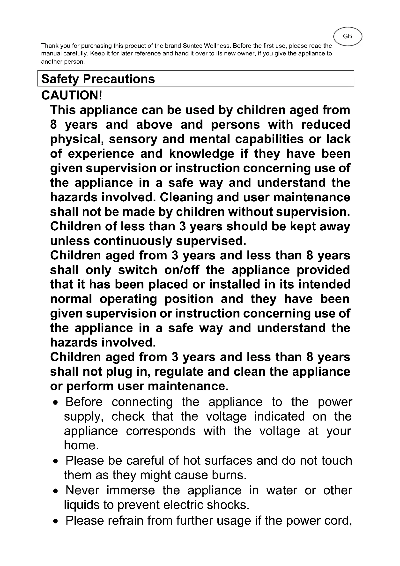 TLW-7024 masterclass SUNTEC WELLNESS GMBH / HOLZSTRASSE 2 / 40 221 DÜSSELDORF / DEUTSCHLANDGB Thank you for purchasing this product of the brand Suntec Wellness. Before the first use, please read the manual carefully. Keep it for later reference and hand it over to its new owner, if you give the appliance to another person. Safety Precautions CAUTION! This appliance can be used by children aged from 8 years and above and persons with reduced physical, sensory and mental capabilities or lack of experience and knowledge if they have been given supervision or instruction concerning use of the appliance in a safe way and understand the hazards involved. Cleaning and user maintenance shall not be made by children without supervision. Children of less than 3 years should be kept away unless continuously supervised. Children aged from 3 years and less than 8 years shall only switch on/off the appliance provided that it has been placed or installed in its intended normal operating position and they have been given supervision or instruction concerning use of the appliance in a safe way and understand the hazards involved. Children aged from 3 years and less than 8 years shall not plug in, regulate and clean the appliance or perform user maintenance.