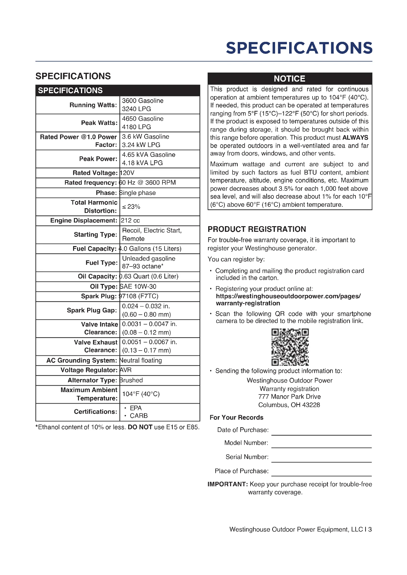 - CARB *Ethanol content of 10% or less. DO NOT use E15 or E85. NOTICE This product is designed and rated for continuous operation at ambient temperatures up to 104°F (40°C). If needed, this product can be operated at temperatures ranging from 5°F (15°C)–122°F (50°C) for short periods. If the product is exposed to temperatures outside of this range during storage, it should be brought back within this range before operation. This product must ALWAYS be operated outdoors in a well-ventilated area and far away from doors, windows, and other vents. Maximum wattage and current are subject to and limited by such factors as fuel BTU content, ambient temperature, altitude, engine conditions, etc. Maximum power decreases about 3.5% for each 1,000 feet above sea level, and will also decrease about 1% for each 10°F (6°C) above 60°F (16°C) ambient temperature. PRODUCT REGISTRATION For trouble-free warranty coverage, it is important to register your Westinghouse generator. You can register by: