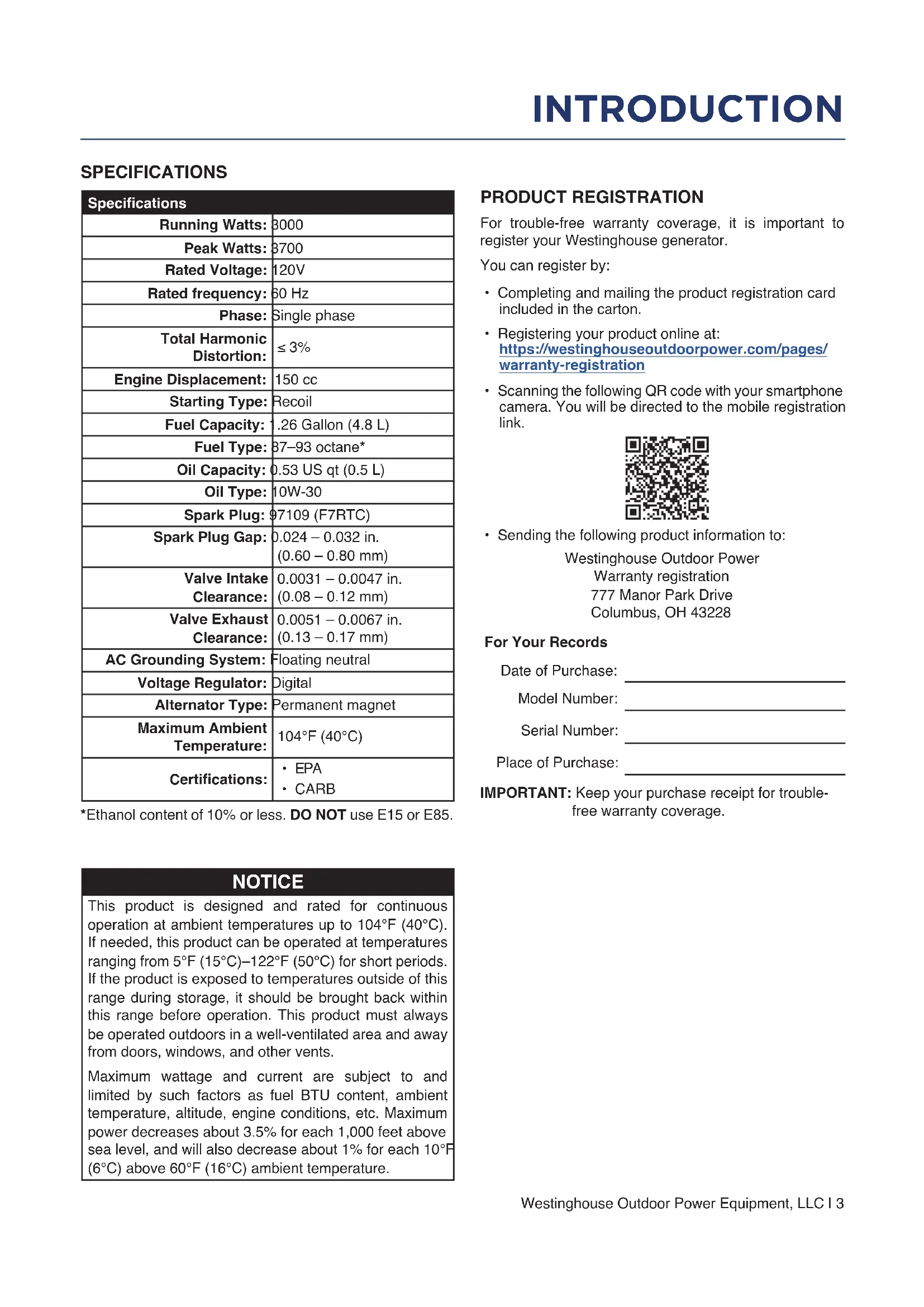 - CARB *Ethanol content of 10% or less. DO NOT use E15 or E85. NOTICE This product is designed and rated for continuous operation at ambient temperatures up to 104°F (40°C). If needed, this product can be operated at temperatures ranging from 5°F (15°C)–122°F (50°C) for short periods. If the product is exposed to temperatures outside of this range during storage, it should be brought back within this range before operation. This product must always be operated outdoors in a well-ventilated area and away from doors, windows, and other vents. Maximum wattage and current are subject to and limited by such factors as fuel BTU content, ambient temperature, altitude, engine conditions, etc. Maximum power decreases about 3.5% for each 1,000 feet above sea level, and will also decrease about 1% for each 10°F (6°C) above 60°F (16°C) ambient temperature. PRODUCT REGISTRATION For trouble-free warranty coverage, it is important to register your Westinghouse generator. You can register by: