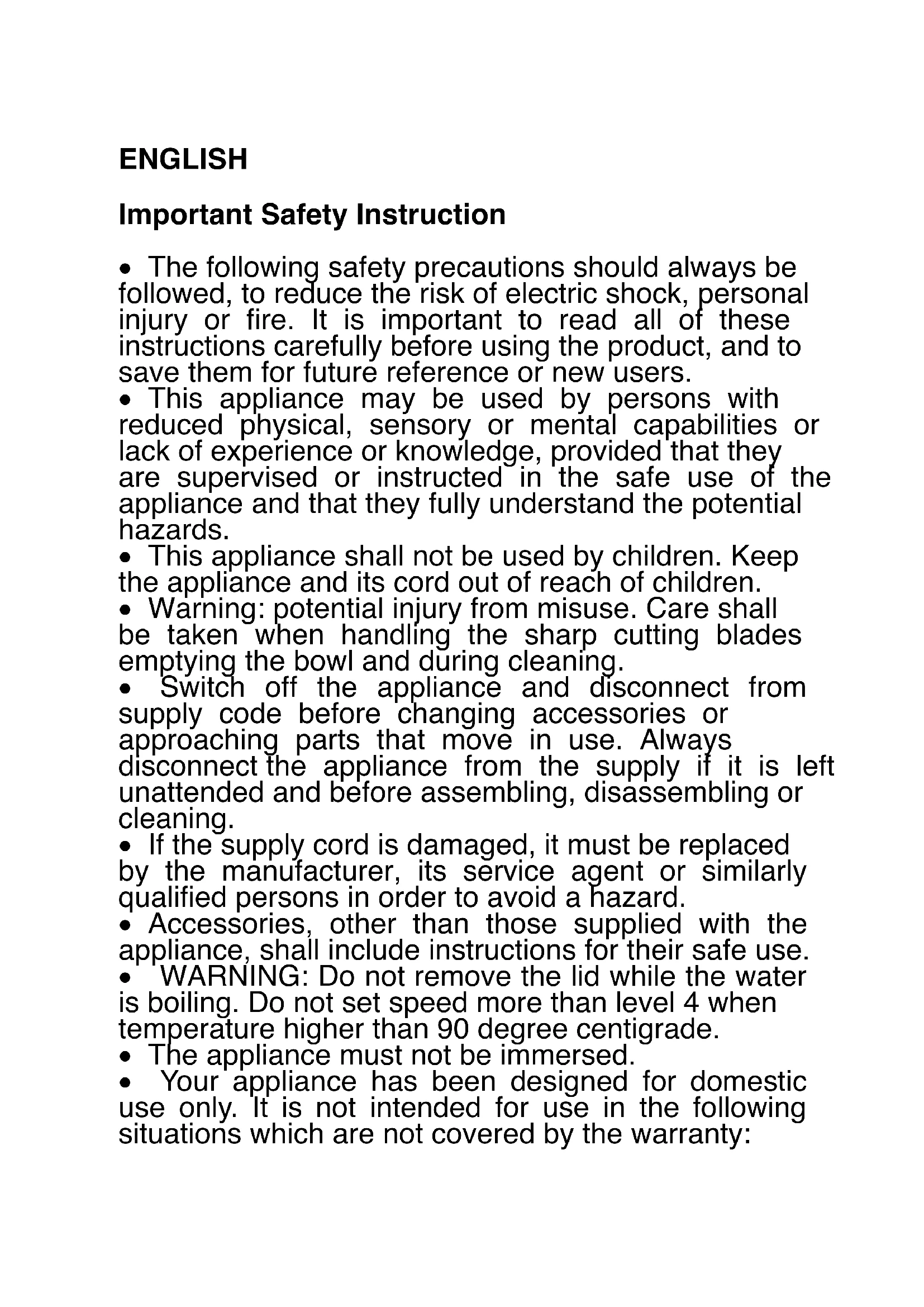 - WARNING: Do not remove the lid while the water is boiling. Do not set speed more than level 4 when temperature higher than 90 degree centigrade.