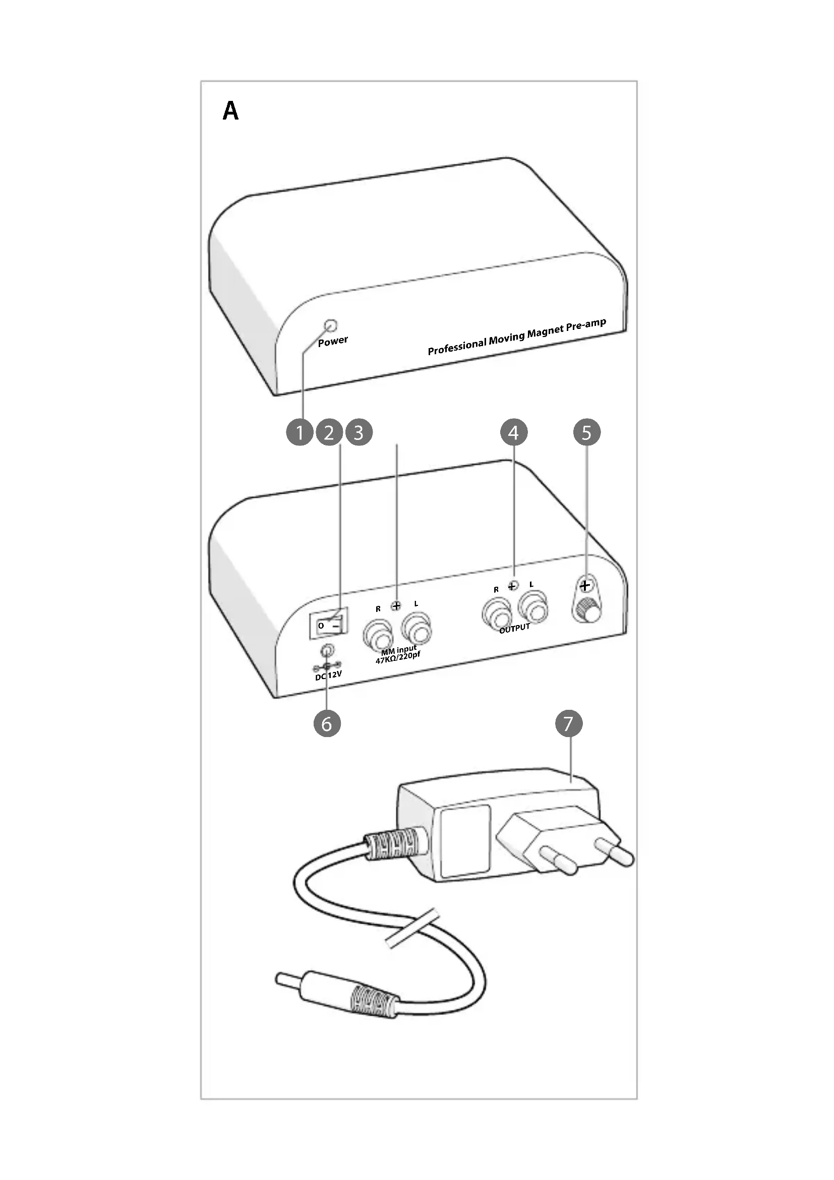 Quick start guide Pre-Amplier AAMP2411BK For more information see the extended manual online: ned.is/aamp2411bk Intended use The Nedis AAMP2411BK is a pre-amplier that you can use to connect an (extra) turntable to your speakers. The product is intended for indoor use only. The product is not intended for professional use. Any modication of the product may have consequences for safety, warranty and proper functioning. Specications Product Pre-Amplier Article number AAMP2411BK Input impedance 47 KΩ / 220 pf RIAA deviation response ± 0.5 dB THD < 0.5 % Input sensitivity 3.0 mV Input overload margin 20 dB Nominal output 300 mV Maximum output power 1.8 V / 1 KHz Signal / noise ratio > 85 dB Output impedance 1 KΩ Connections 1 RCA input 1 RCA output Power input 12 VDC ; 0.5 A Main parts (image A) 1 Power indicator LED 2 Power switch 3 RCA input 4 RCA output 5 Ground wheel 6 Power input 7 Power adapter5 Safety instructions