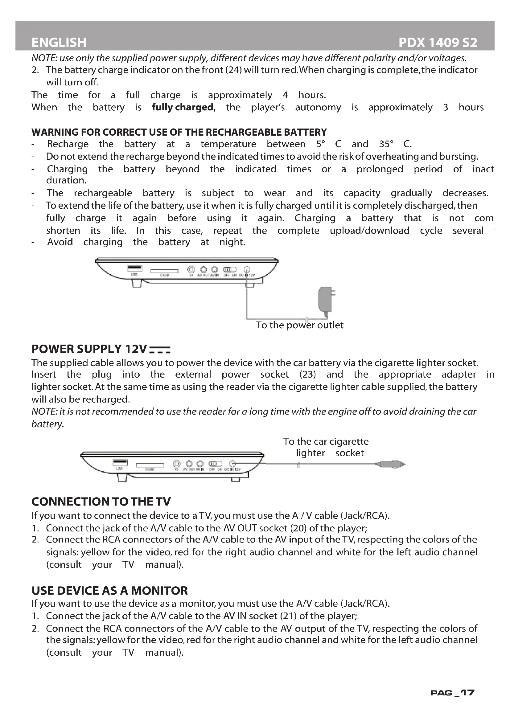 will turn off. The time for a full charge is approximately 4 hours. When the battery is fully charged, the player’s autonomy is approximately 3 hours in DVD mode. WARNING FOR CORRECT USE OF THE RECHARGEABLE BATTERY - Recharge the battery at a temperature between 5° C and 35° C. - Do not extend the recharge beyond the indicated times to avoid the risk of overheating and bursting. - Charging the battery beyond the indicated times or a prolonged period of inactivity can reduce its duration. - The rechargeable battery is subject to wear and its capacity gradually decreases. - To extend the life of the battery, use it when it is fully charged until it is completely discharged,then fully charge it again before using it again. Charging a battery that is not completely depleted will shorten its life. In this case, repeat the complete upload/download cycle several times. - Avoid charging the battery at night.