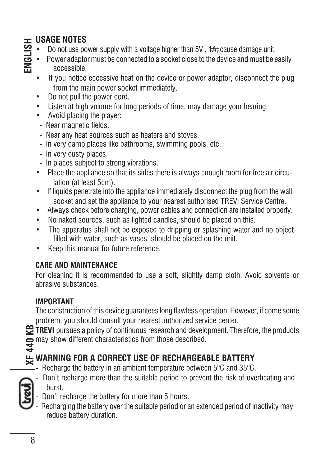 For cleaning it is recommended to use a soft, slightly damp cloth. Avoid solvents or abrasive substances. IMPORTANT The construction of this device guarantees long flawless operation. However, if come some problem, you should consult your nearest authorized service center. TREVI pursues a policy of continuous research and development. Therefore, the products may show different characteristics from those described. WARNING FOR A CORRECT USE OF RECHARGEABLE BATTERY - Recharge the battery in an ambient temperature between 5°C and 35°C. - Don’t recharge more than the suitable period to prevent the risk of overheating and burst. - Don’t recharge the battery for more than 5 hours. - Recharging the battery over the suitable period or an extended period of inactivity may reduce battery duration. ENGLISHXF 440 KB