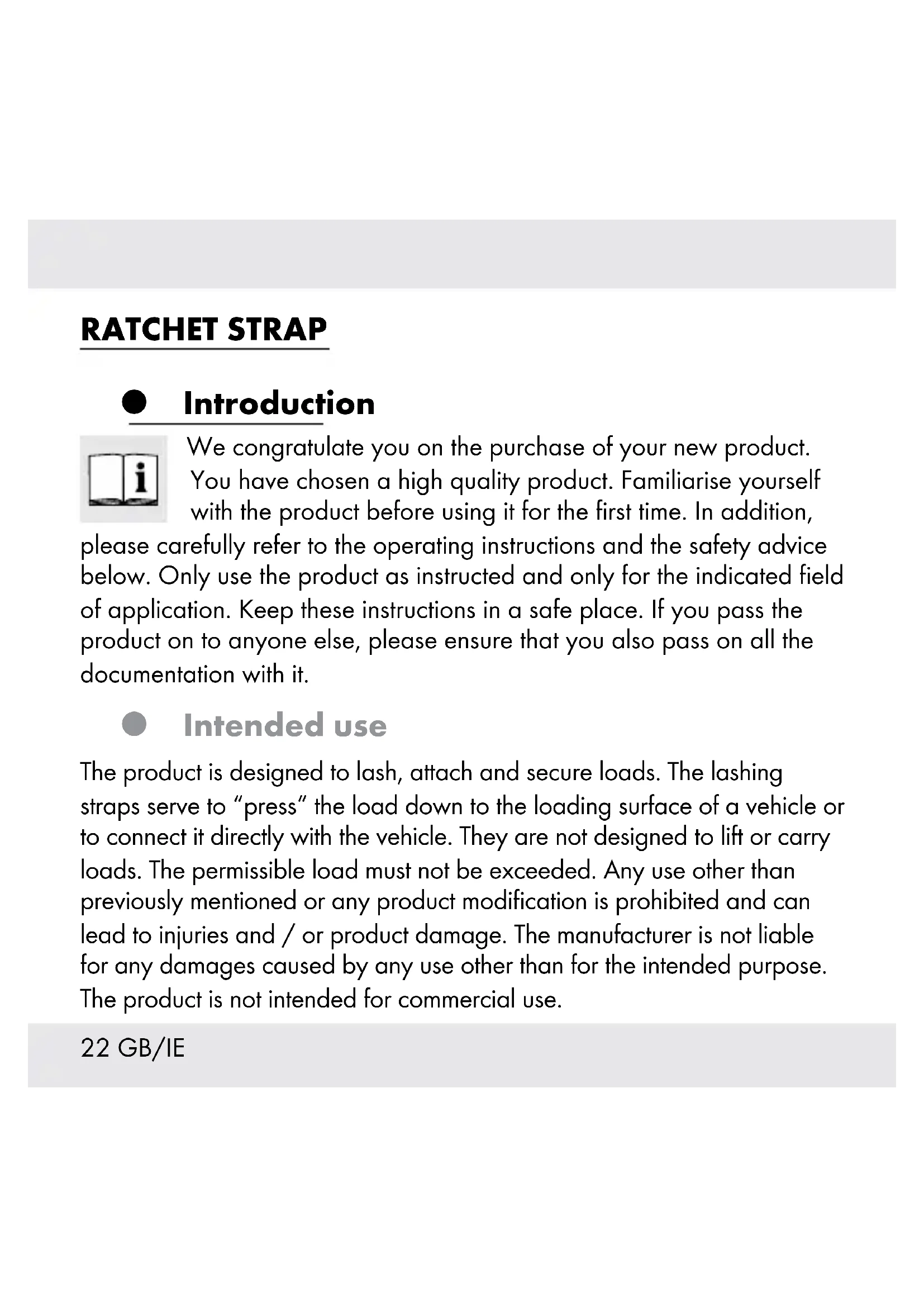 25 daN Material: Polyester (PES) Scope of delivery Check the delivery for completeness and condition of the product immediately after opening and ensure all parts are included. 1 x Ratchet strap 1 x Directions for use24 GB/IE Safety instructions KEEP ALL THE SAFETY ADVICE AND INSTRUCTIONS IN A SAFE PLACE FOR FUTURE REFERENCE! General safety instructions