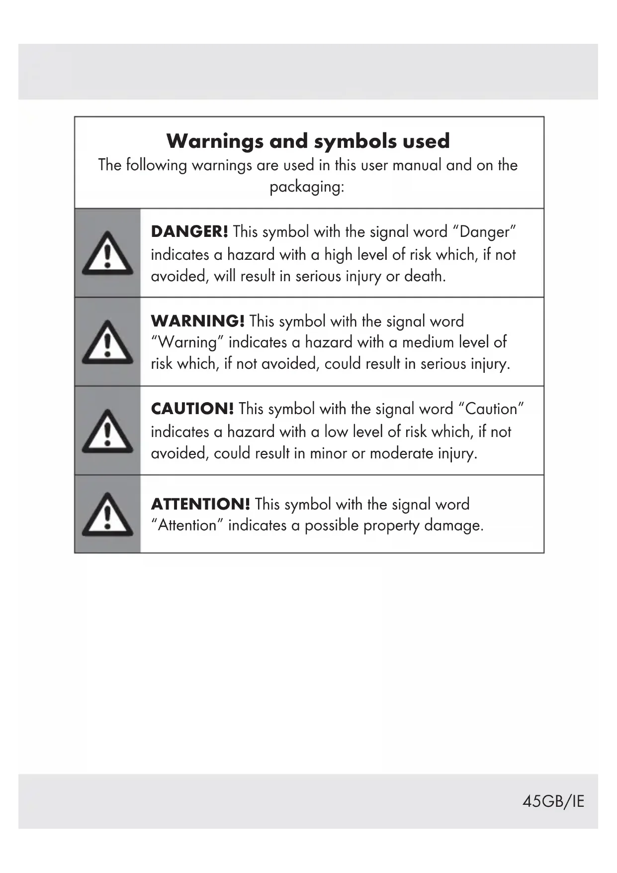 This appliance can be used by children aged from 8 years and above and persons with reduced physical, sensory or mental capabilities or lack of experience and knowledge if they have been given supervision or instruction concerning use of the appliance in a safe way and understand the hazards involved.67GB/IE Children shall not play with the appliance. Cleaning and user maintenance shall not be made by children without supervision. Do not charge non-rechargeable batteries. Disregarding this instruction is hazardous. Protect the electrical parts against moisture. Do not immerse such parts in water or other liquids to avoid electrical shock. Never hold the appliance under running water. Pay attention to the instructions provided for cleaning, maintenance and repair. The appliance is suitable for indoor use only.68 GB/IE z Residual risks Even if you are operating this product in accordance with all the safety requirements, potential risks of injury and damage remain. The following dangers can arise in connection with the structure and design of this product: Health defects resulting from vibration emission if the product is being used over long periods of time or not adequately managed and properly maintained. Injuries and damage to property due to broken accessory tools or the sudden impact of hidden objects during use. Danger of injury and property damage caused by flying objects. NOTE